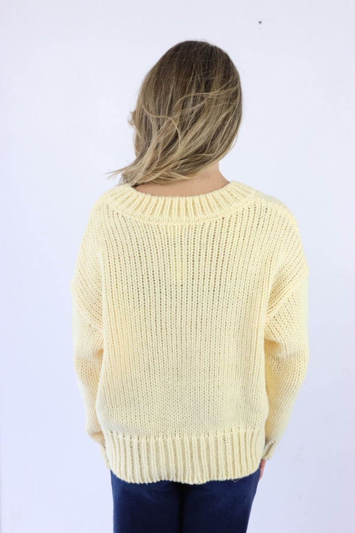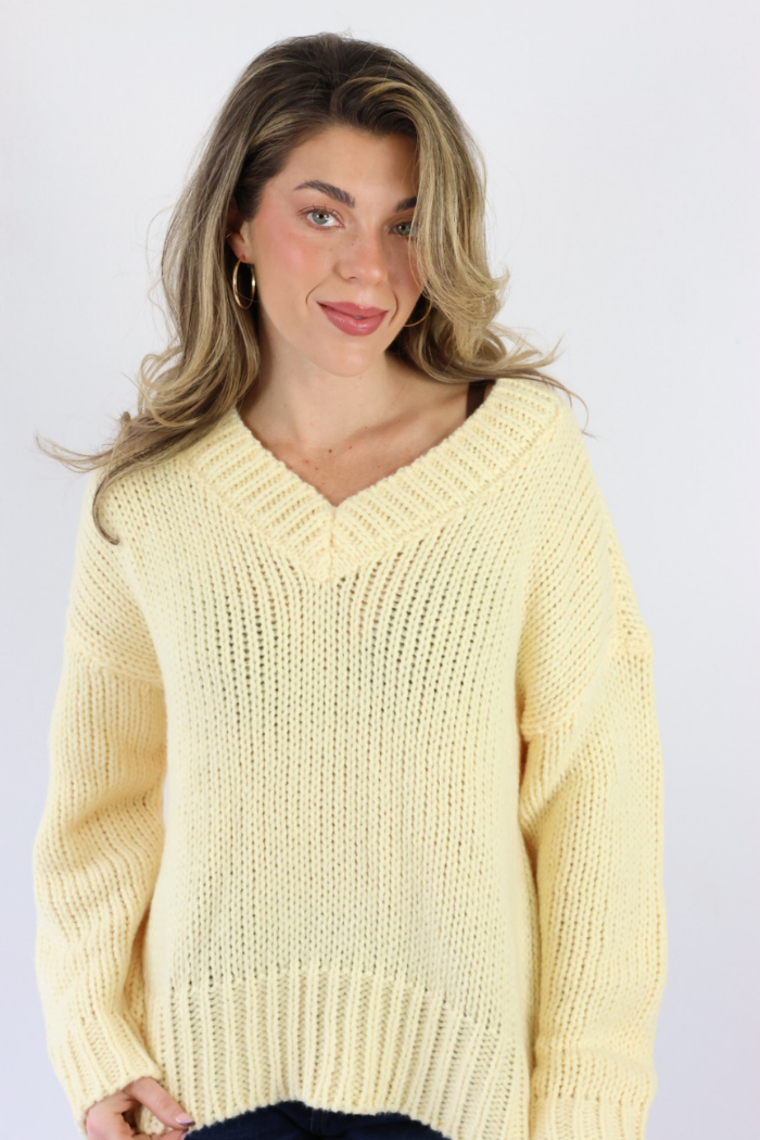 Brighten your wardrobe with this balloon sleeve V neck sweater in a cheerful yellow shade, perfect for Nashville style that feels fresh and effortless. Designed for cooler days going into spring, this sweater features soft volume in the sleeves and a flattering neckline that elevates any outfit. Style it with denim, tailored pants, or a flowy skirt for a polished look that works for brunch, errands, or casual nights out and feels timeless for all ages!