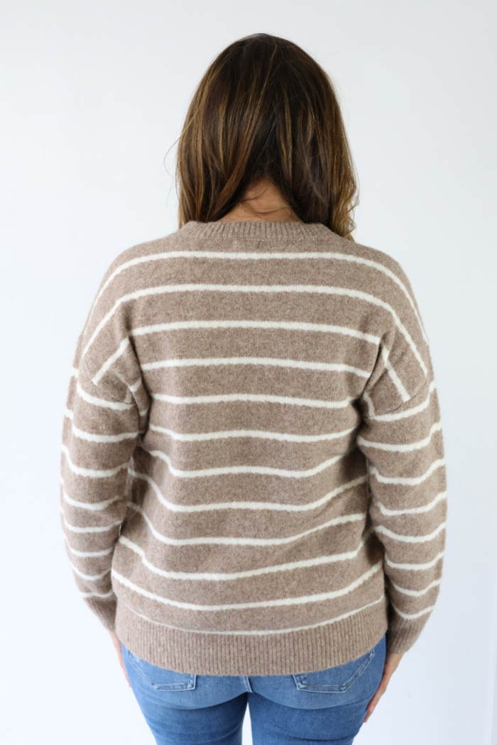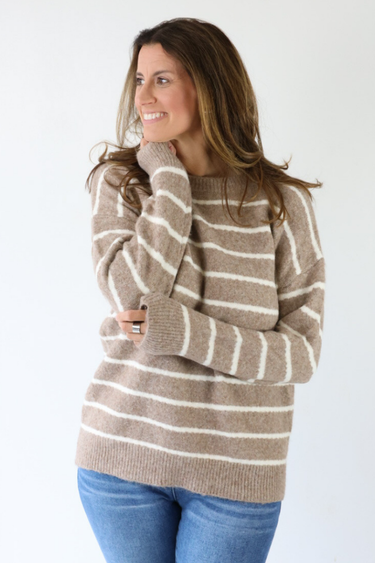 Crew Neck Fuzzy Striped Sweater in Taupe