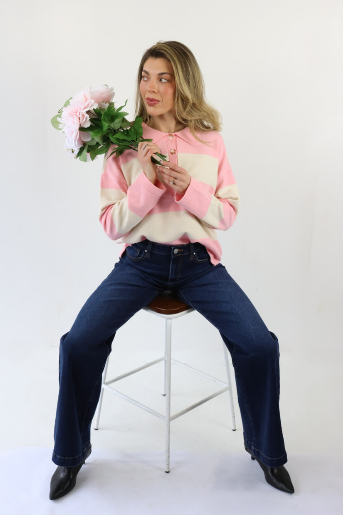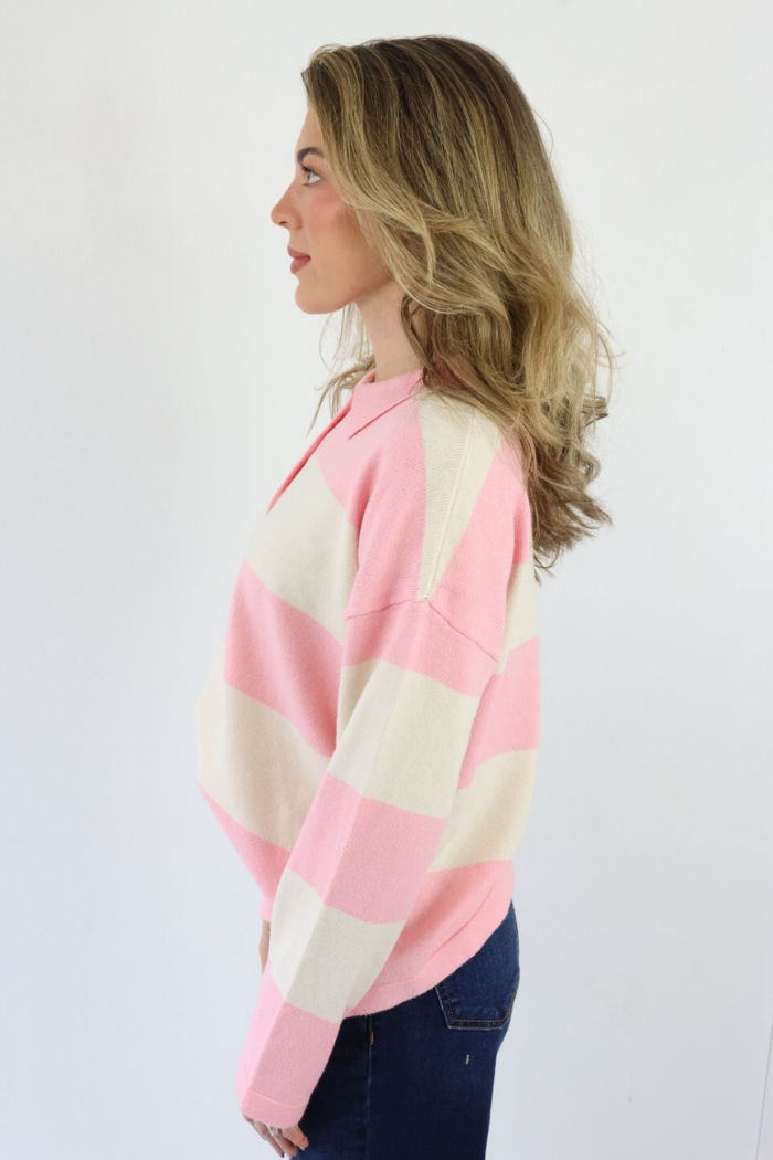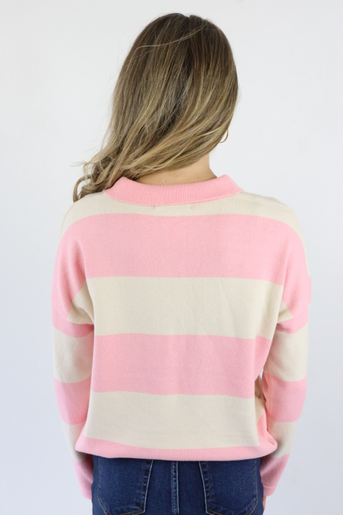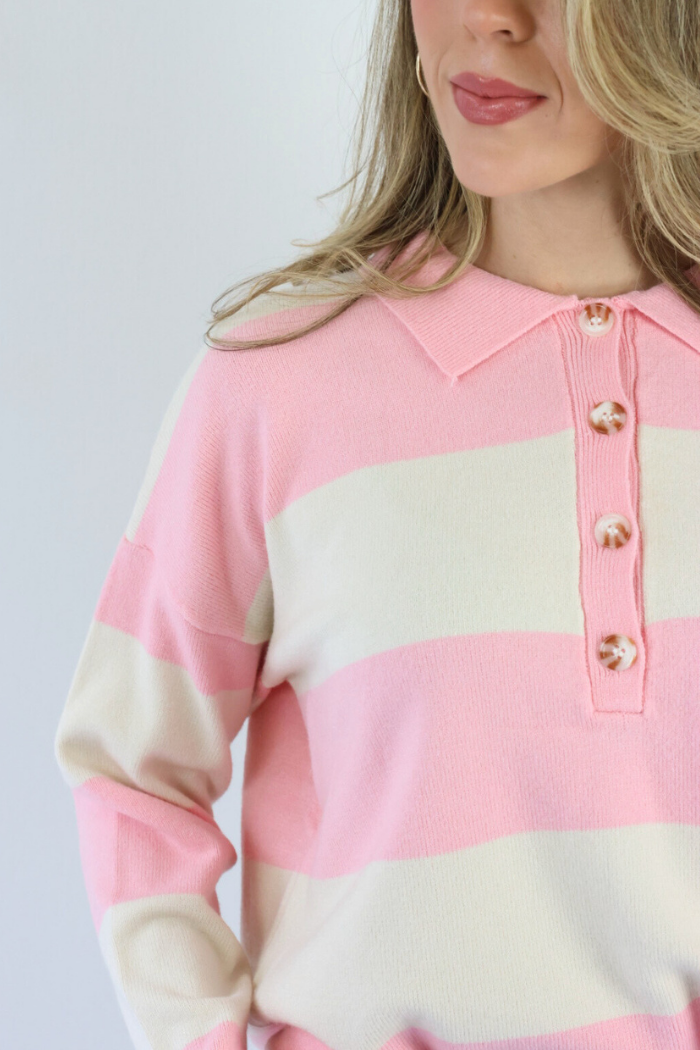 Add a fresh pop of color to your wardrobe with this collared pink striped sweater, designed for trendy Nashville style that feels polished yet relaxed. Featuring long sleeves, a quarter button front, and a classic collar, this sweater blends preppy charm with modern ease. Style it with denim for everyday wear or dress it up with tailored pants for a chic look that works for all ages and seasons!