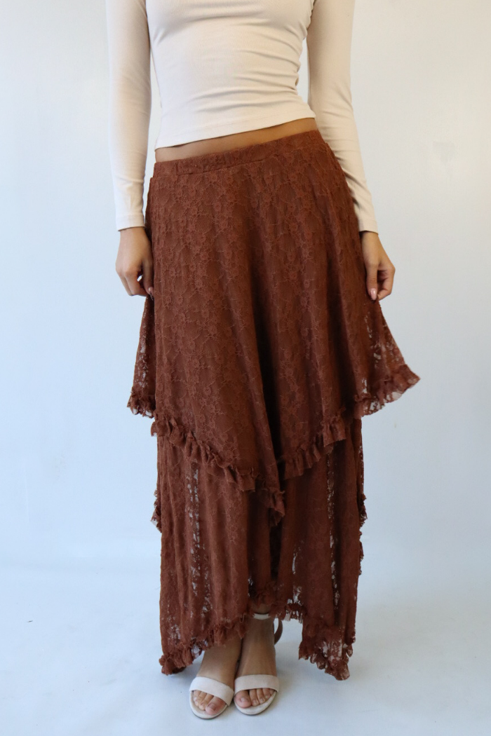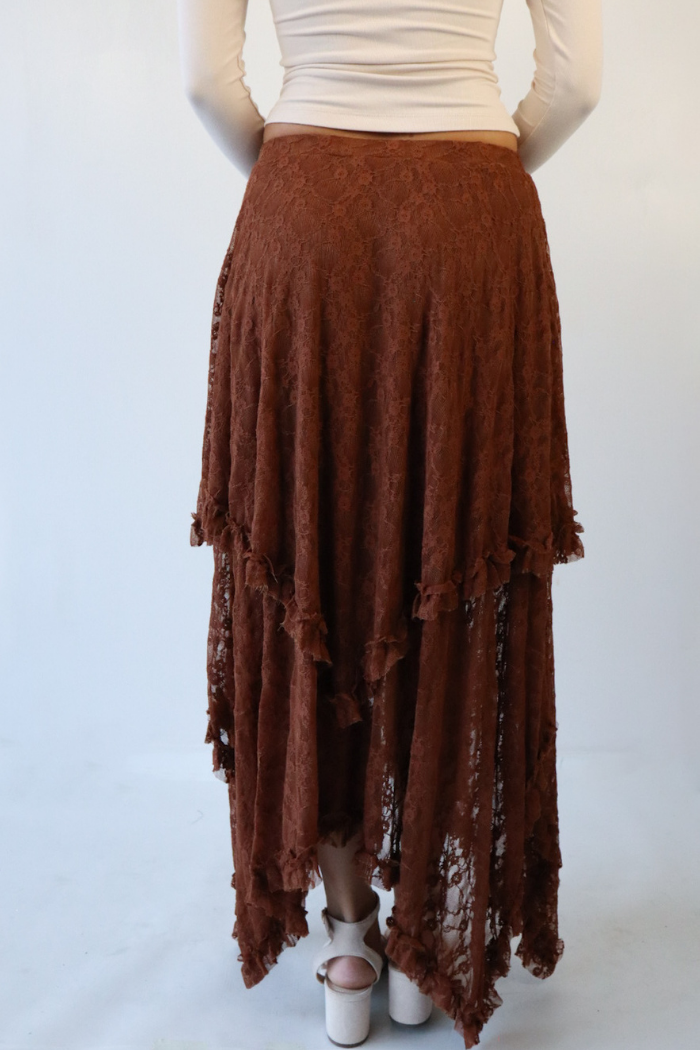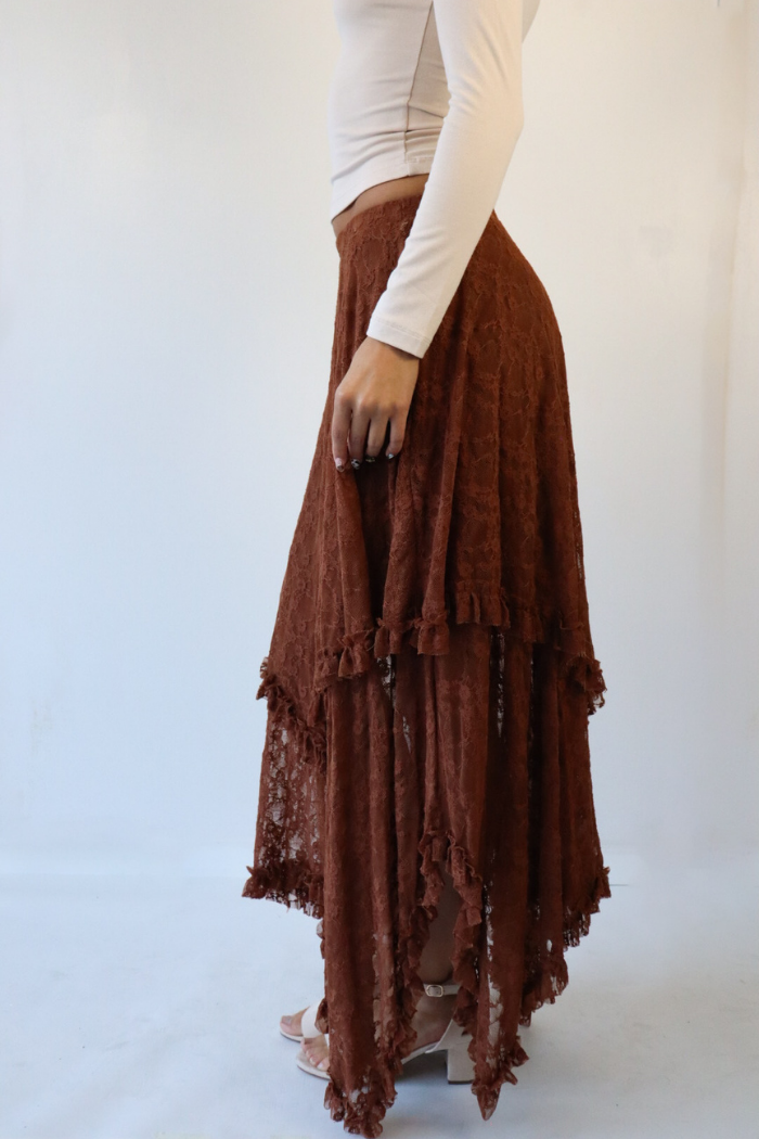 Layered Hem Lace Midi Skirt in Brown