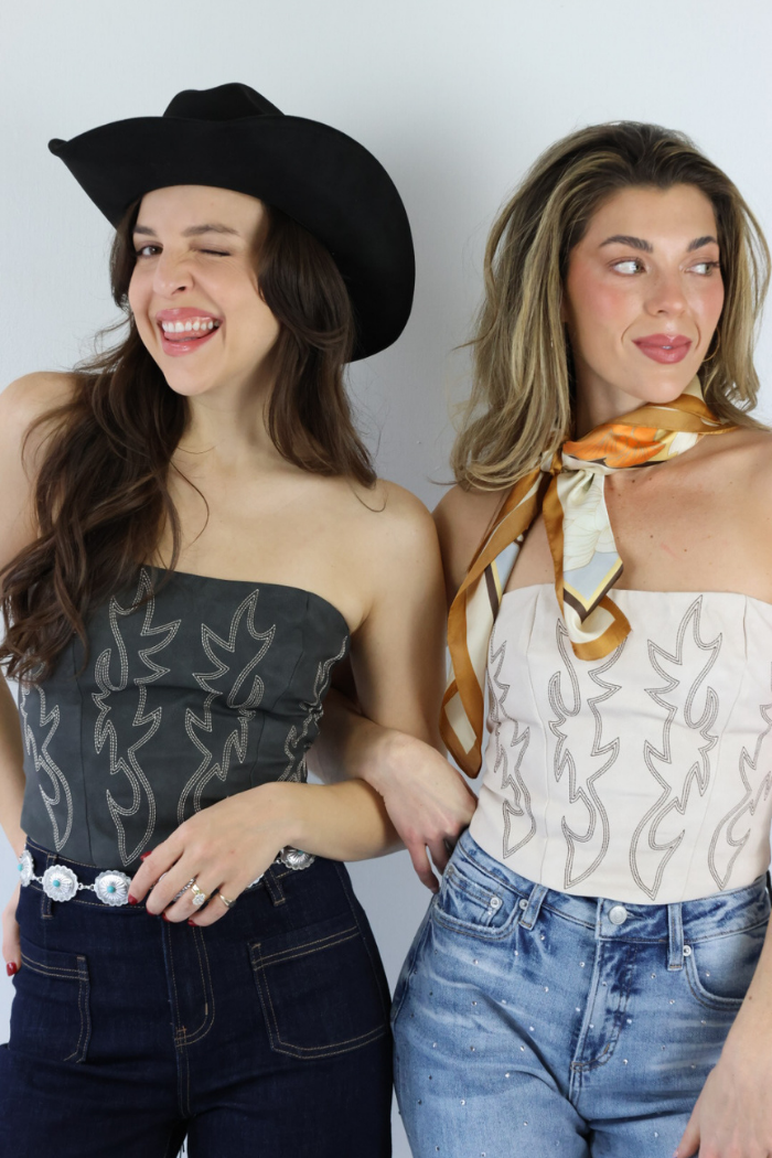 Make a bold statement in the Faux Leather Embroidered Western Corset Top in Black. Designed with a strapless bandeau fit and boned panel construction, this crop top brings a modern twist to classic western fashion. The intricate embroidered detailing and rope lace-up back add eye-catching texture, perfect for festival days or Nashville nights. Style it with denim shorts and boots for a western-chic look that turns heads!