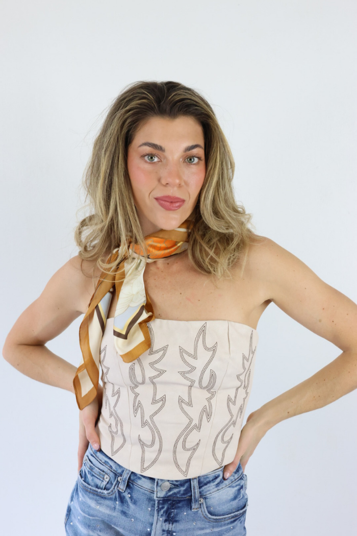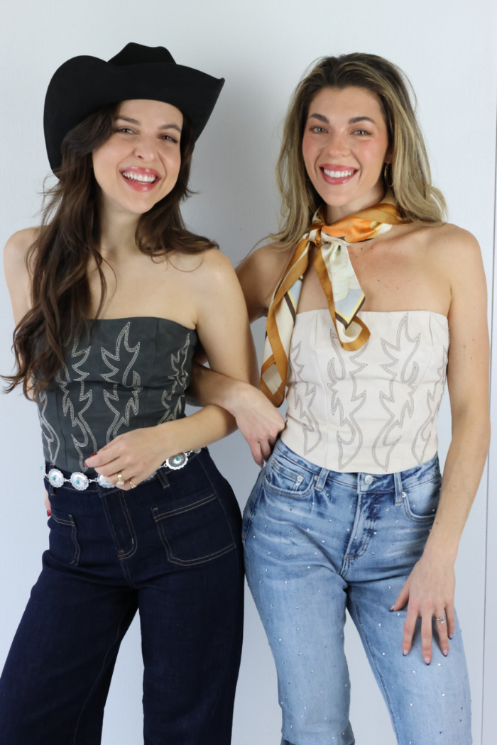 Make a bold statement in the Faux Leather Embroidered Western Corset Top in Cream. Designed with a strapless bandeau fit and boned panel construction, this crop top brings a modern twist to classic western fashion. The intricate embroidered detailing and rope lace-up back add eye-catching texture, perfect for festival days or Nashville nights. Style it with denim shorts and boots for a western-chic look that turns heads!