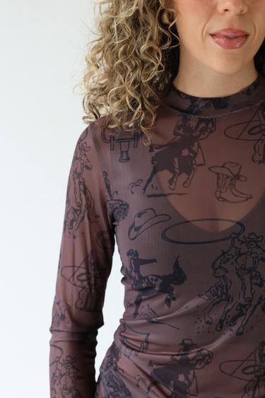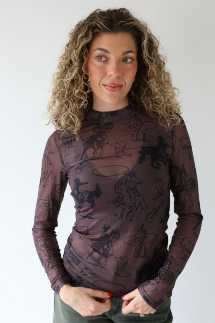 Bring Nashville flair to your wardrobe with this brown mock neck Cowgirl Print Mesh Top featuring a monochrome dark brown western design. Perfect for layering under jackets or styling with a NikiBiki tank for coverage, this versatile top works for all ages and pairs effortlessly with high waist jeans or skirts. Add boots for a full western-inspired look that is both trendy and comfortable!