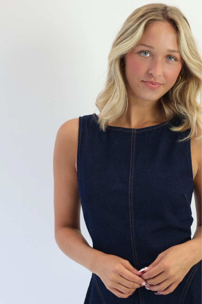 Step out in the Stitch Detail Mini Dress for an effortlessly chic Nashville look! This denim mini features a flattering boat neckline, playful tie-back with bow detail, and a fitted silhouette that’s perfect for day-to-night styling. Pair it with ankle boots and a crossbody bag for a casual city vibe or dress it up with heels for brunch or evening outings this season!
