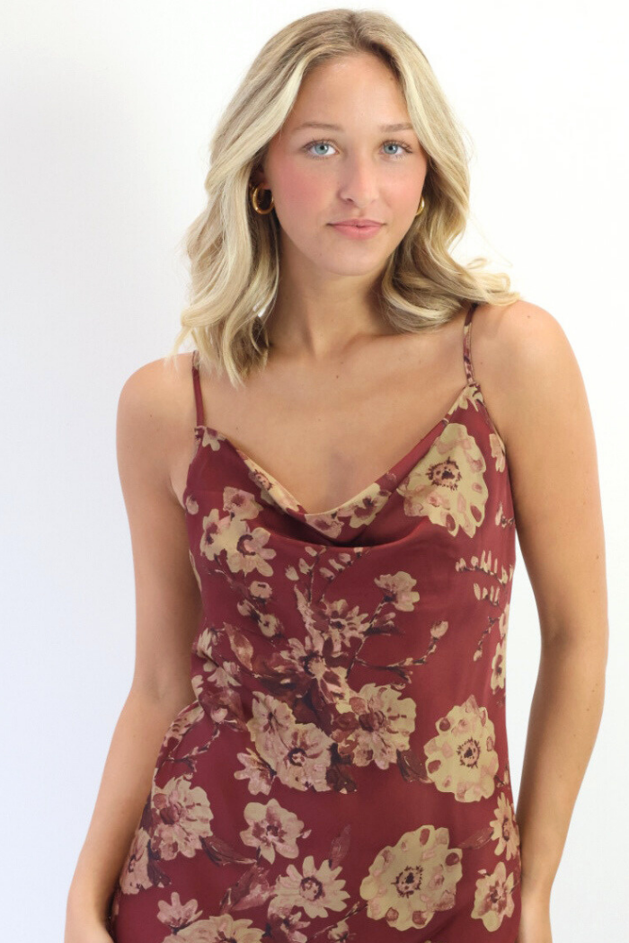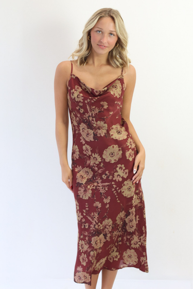Make a statement at your next fall wedding in the Cowl Neck Floral Dress in Red! This stunning red floral spaghetti-strap dress features a flattering cowl neckline and flowy silhouette, creating a romantic and feminine look. Pair it with nude heels and delicate jewelry for a timeless, chic outfit perfect for weddings, brunches, or special events this season!