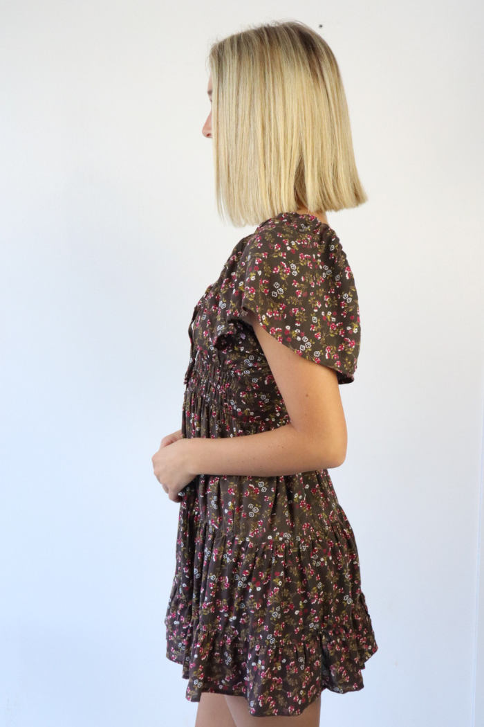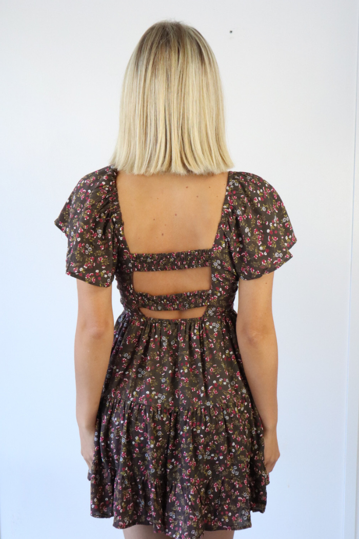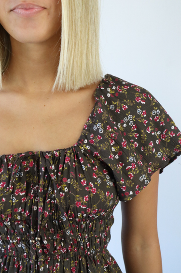 Fall in love with our Ditsy Floral Mini Dress in Brown! This charming short-sleeve dress features a flattering square neckline and an open back with an elastic strap for the perfect fit. The flowy silhouette and delicate floral print make it ideal for fall outings, brunch dates, or strolls through Nashville. Style it with ankle boots and a denim jacket for an effortlessly feminine and trendy look that captures the season perfectly!