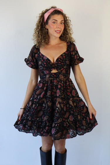 Turn heads in our Twist Front Paisley Mini Dress! Featuring a stunning mix of black and mauve patterns, this dress brings effortless style and feminine charm to any occasion. The twist front detail accentuates your shape, while the flowy silhouette keeps it comfortable and flattering. Pair it with boots and gold jewelry for a trendy Nashville vibe or heels and a clutch for a night out that shines!