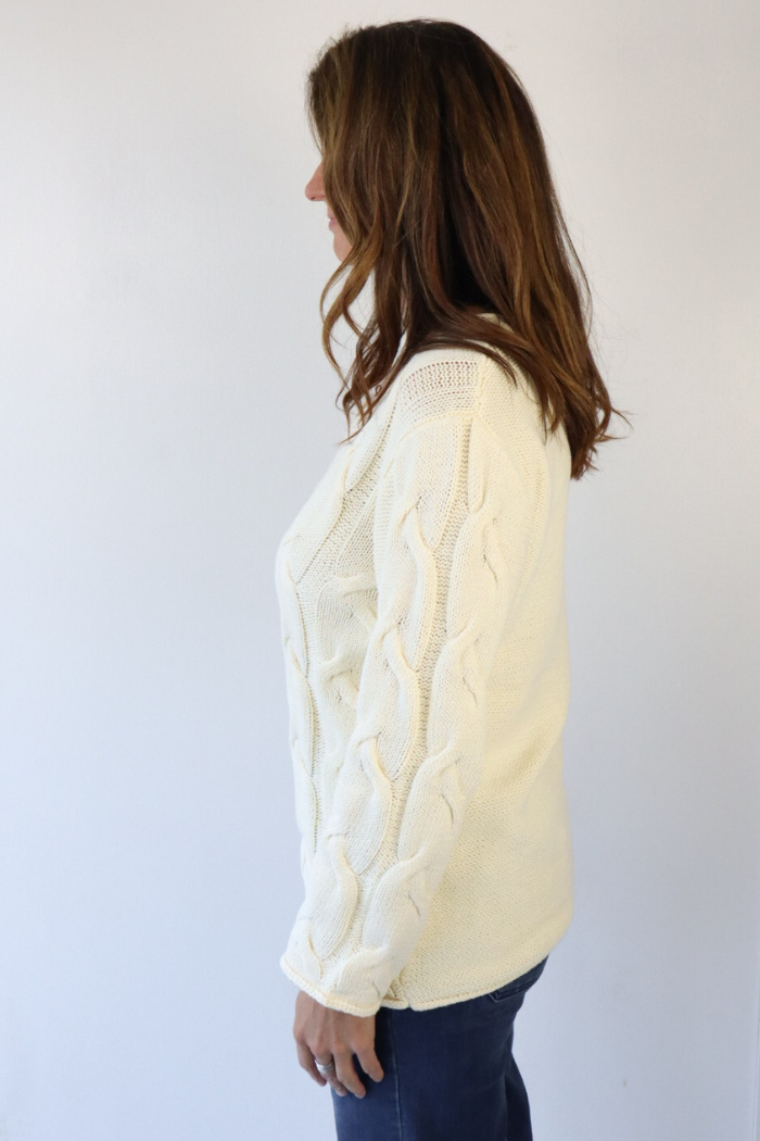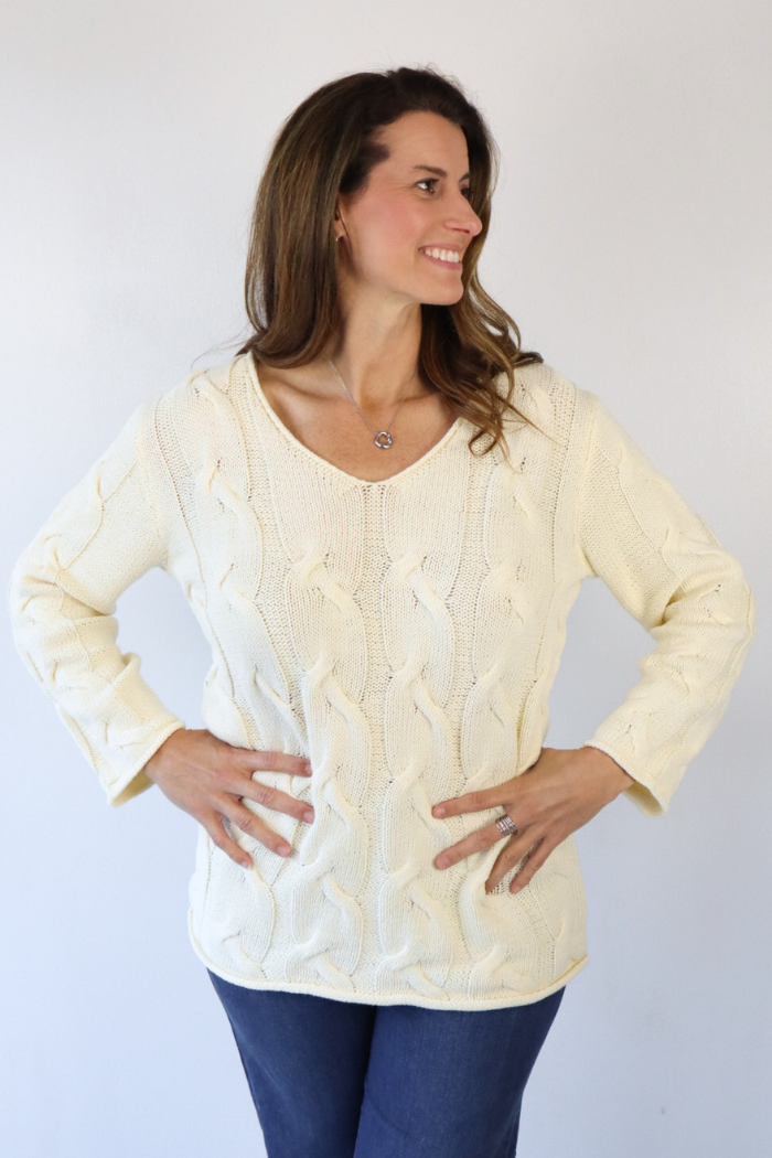 V-Neck Long Cable Sweater in Cream