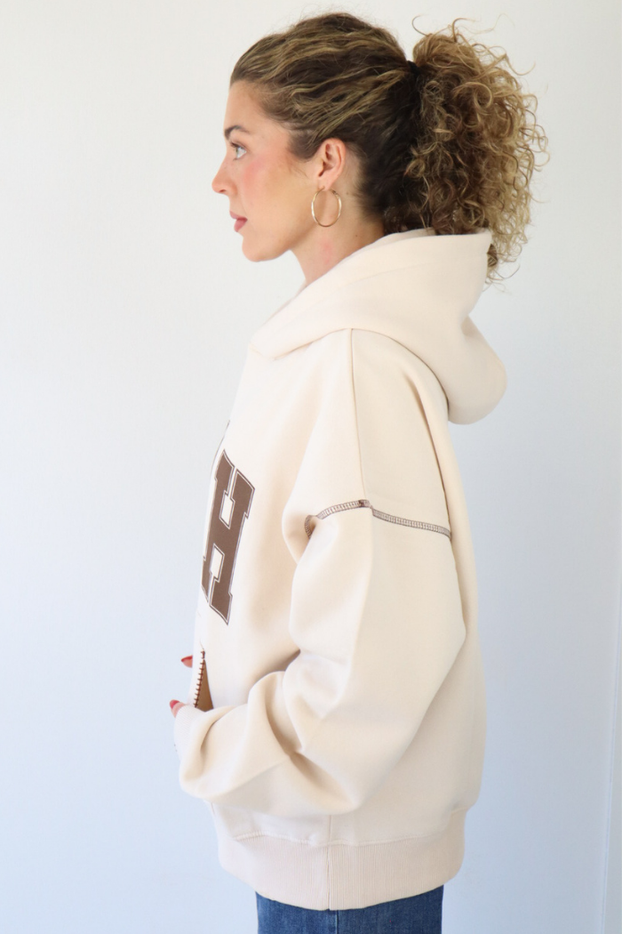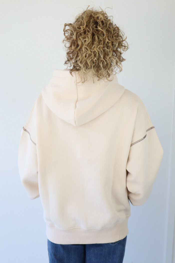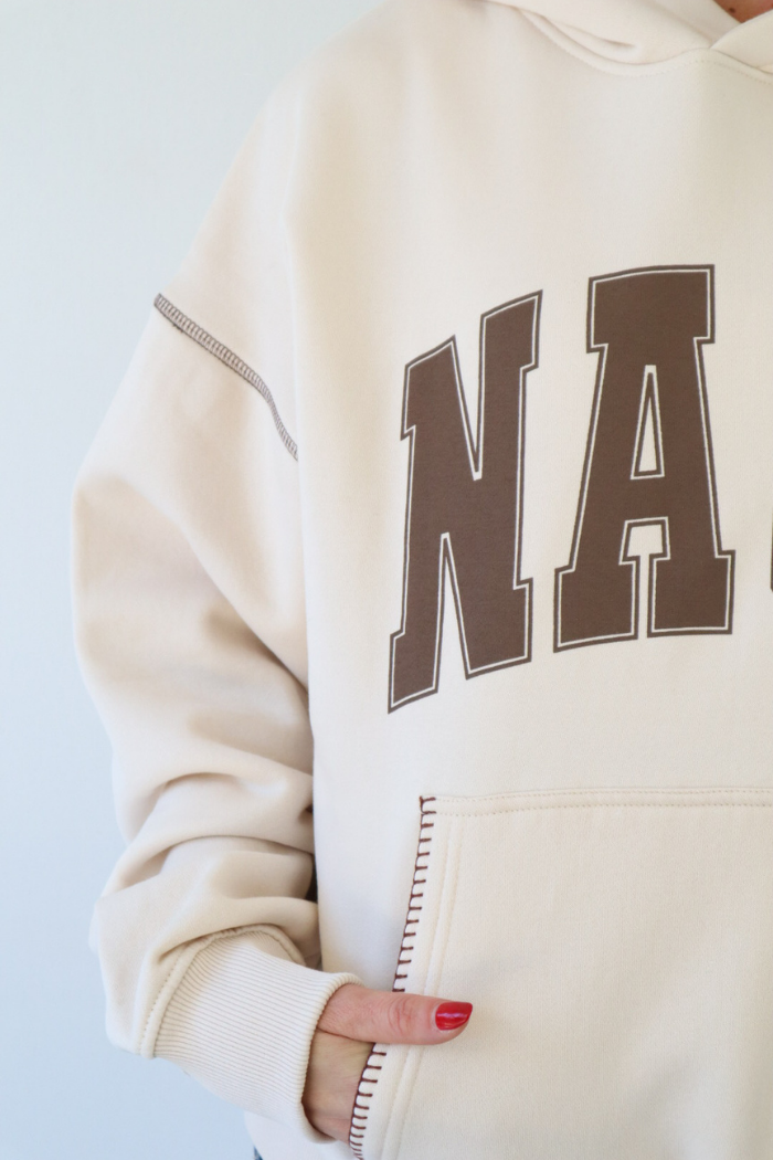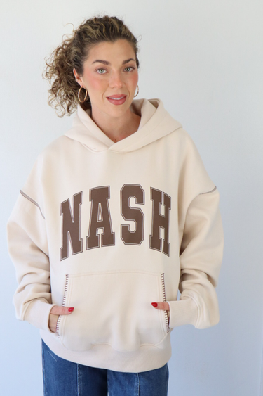 Stay warm and stylish in the Camp Fire Hoodie in Cream, your new go-to for cozy Nashville days! This oversized sweatshirt features soft cream fabric with contrasting brown stitching and bold NASH lettering for a trendy, laid-back look. Pair it with leggings and sneakers for casual weekends or layer it over jeans and boots for effortless cool weather style. Perfect for lounging or exploring the city in comfort and confidence!