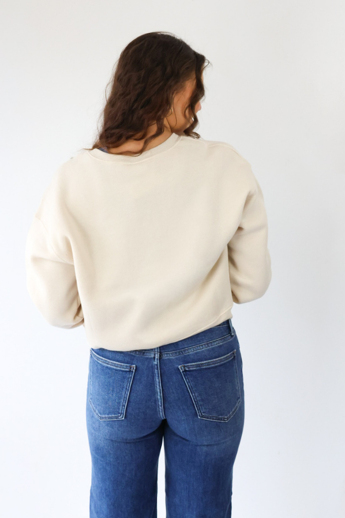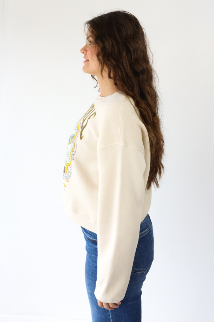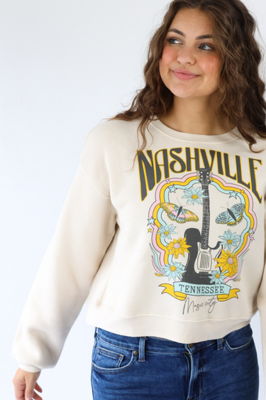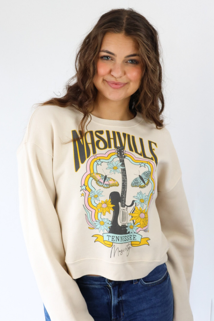 Celebrate Music City style with the Nashville Butterfly Sweatshirt in Oat, a vibrant and playful addition to your wardrobe. Featuring a bright wildflower and butterfly guitar design in pink, yellow, and blue, this cozy sweatshirt captures the fun and energy of Nashville. Pair it with jeans and sneakers for a casual downtown look or layer under a jacket for effortless weekend style. Perfect for music lovers and trendsetters alike!