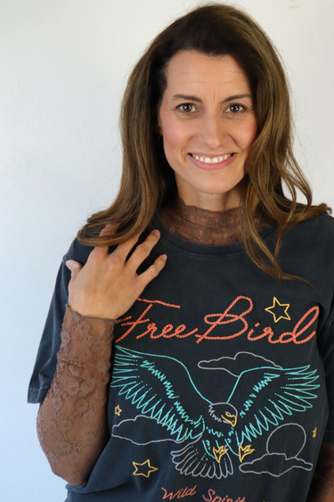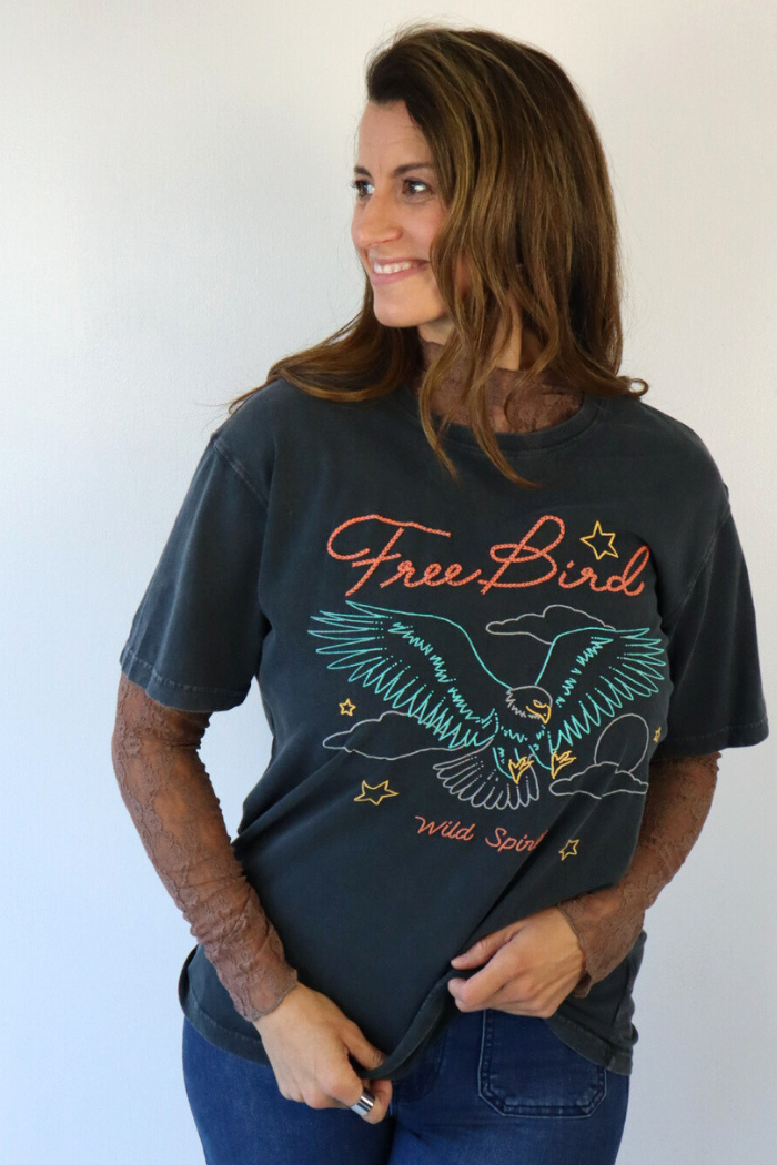 Bring bold energy to your everyday look with our Oversized Multicolor Free Bird Tee in Black! This statement graphic tee features a vibrant multicolor design that adds a pop of personality to any outfit. The relaxed, oversized fit makes it perfect for pairing with denim shorts, biker leggings, or distressed jeans for that effortlessly cool Nashville street style. Dress it up with layered jewelry and boots for a fun, fashion-forward vibe that stands out!