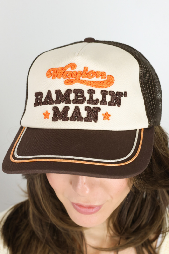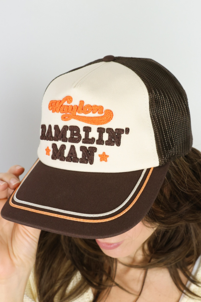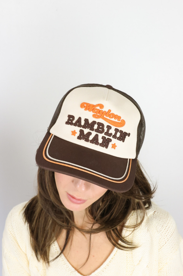 The Waylon Ramblin Trucker hat in ivory and brown features bold "Waylon Ramblin Man" embroidery in brown and orange with a pop of orange detail on the bill for a trendy, statement-making look. Perfect for casual Nashville outfits, it pairs effortlessly with jeans, tees, and boots or layered streetwear for all ages. Style it to add personality and flair to everyday ensembles while keeping your look modern, fun, and fashion-forward!