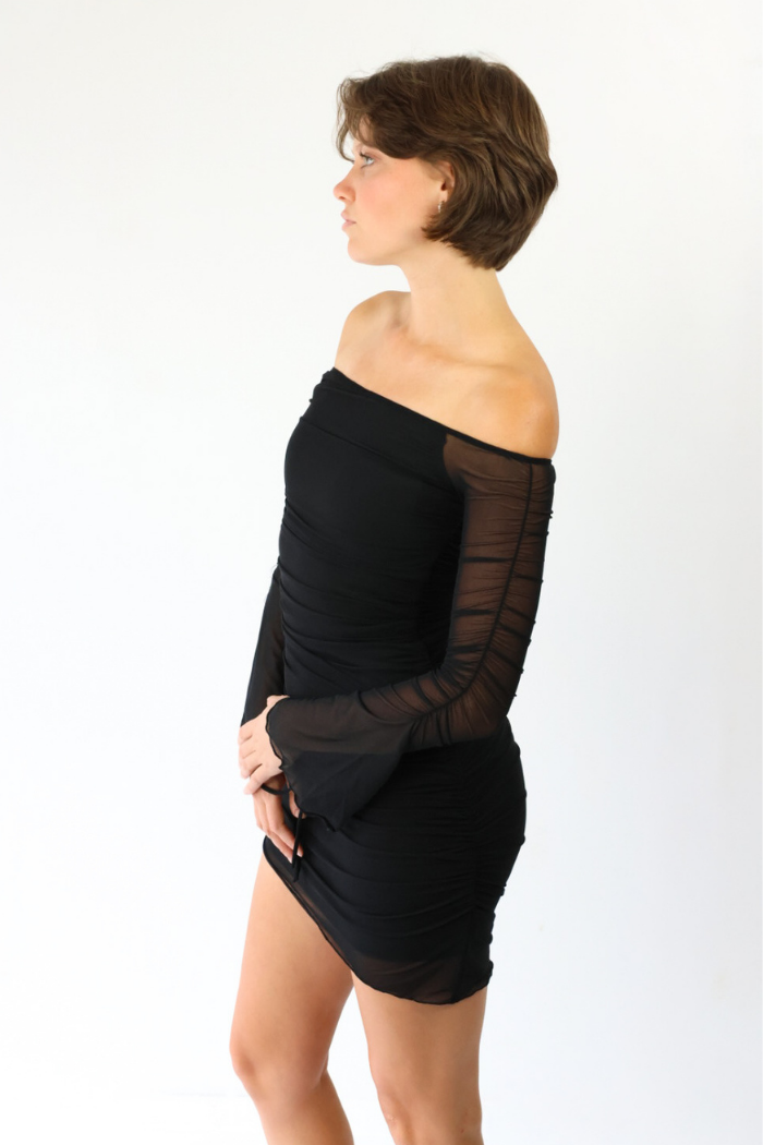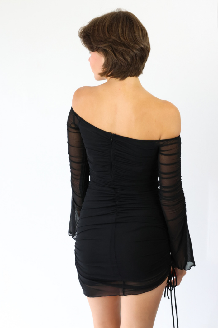 Off-Shoulder Mesh Ruched Dress in Black