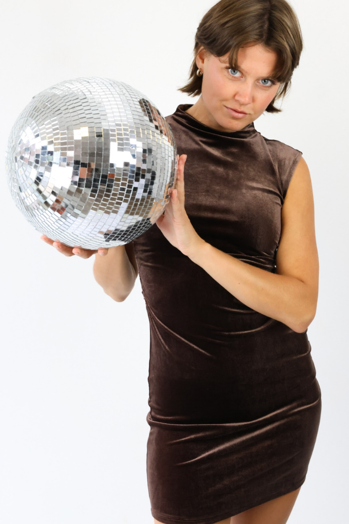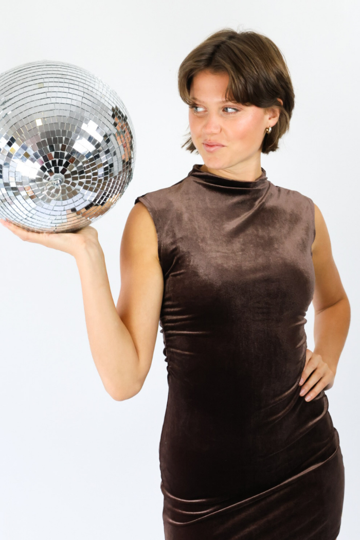 Step into the season in style with our Velvet Brown Mini Dress! This sleeveless mock neck design features a rich brown velvet fabric that gives off a luxurious, festive feel perfect for the holidays. Its soft texture and flattering fit make it an elegant choice for parties or special events. Pair it with gold jewelry and heels for a sophisticated Nashville-inspired look that shines all night!