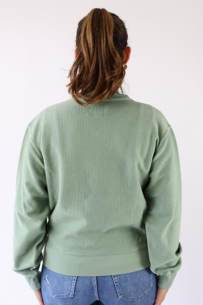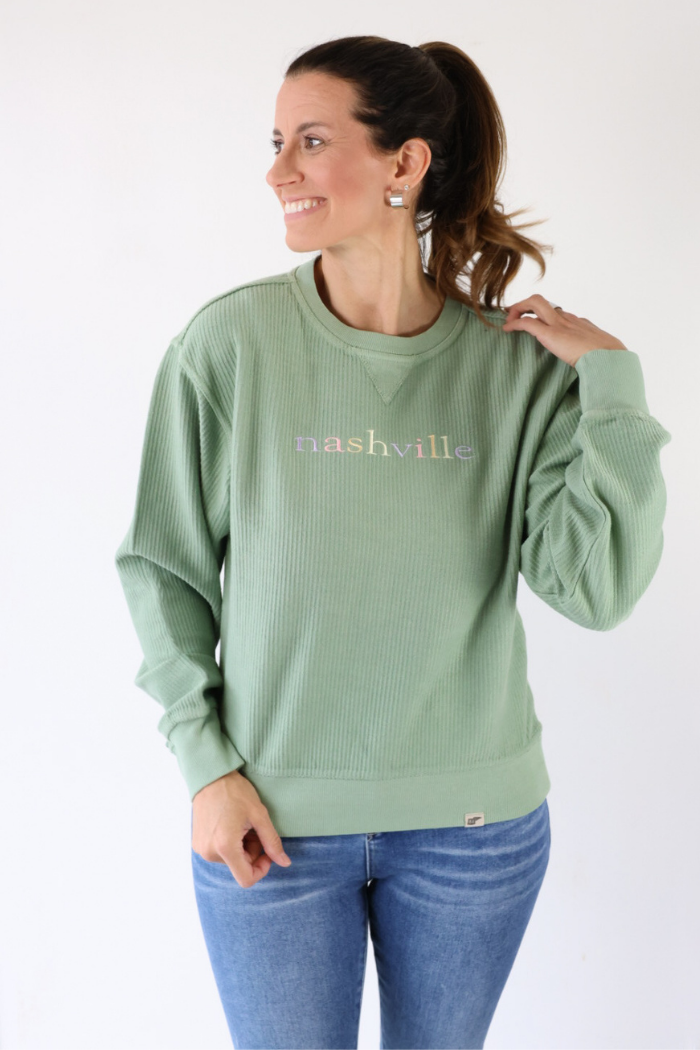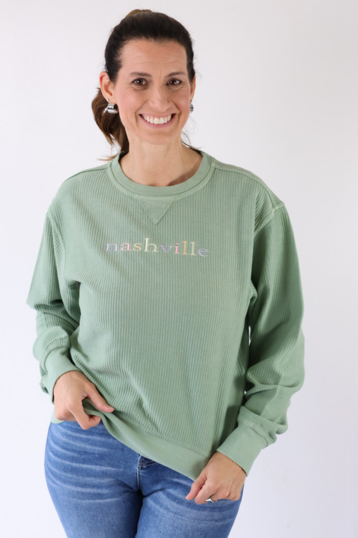 This green corded crew is a Nashville favorite, featuring a bold multicolor Nashville graphic that adds fun, trendy style for all ages. Its cozy, textured design is perfect for locals and visitors looking to capture that effortless Music City vibe. Style it with denim, biker shorts, or layered over a collared top for a cool and comfortable look that works year round!