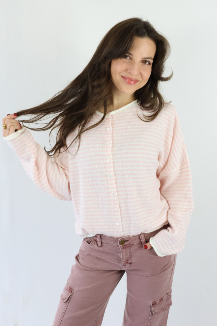 Add a playful pop to your wardrobe with this raw-edge pink striped cardigan, designed for effortless Nashville style with a modern twist. This full button-up cardigan features soft white and pink stripes that feel fresh, feminine, and easy to wear year-round. Style it buttoned up with denim for a polished look or wear it open over a tank or dress for relaxed layering that works for every age and season!
