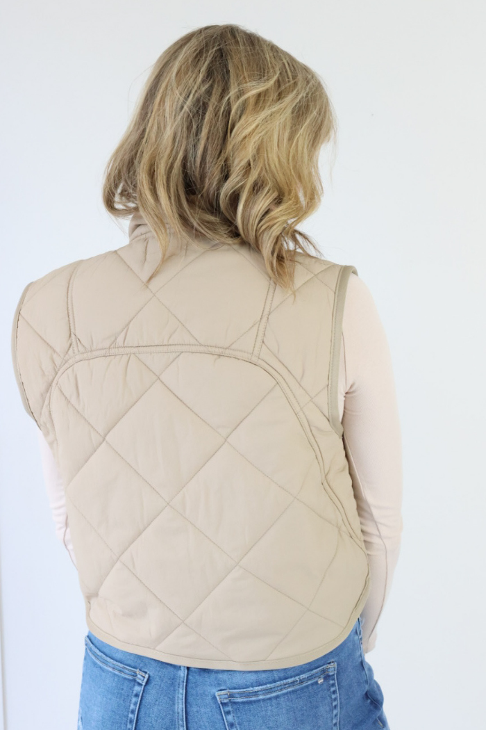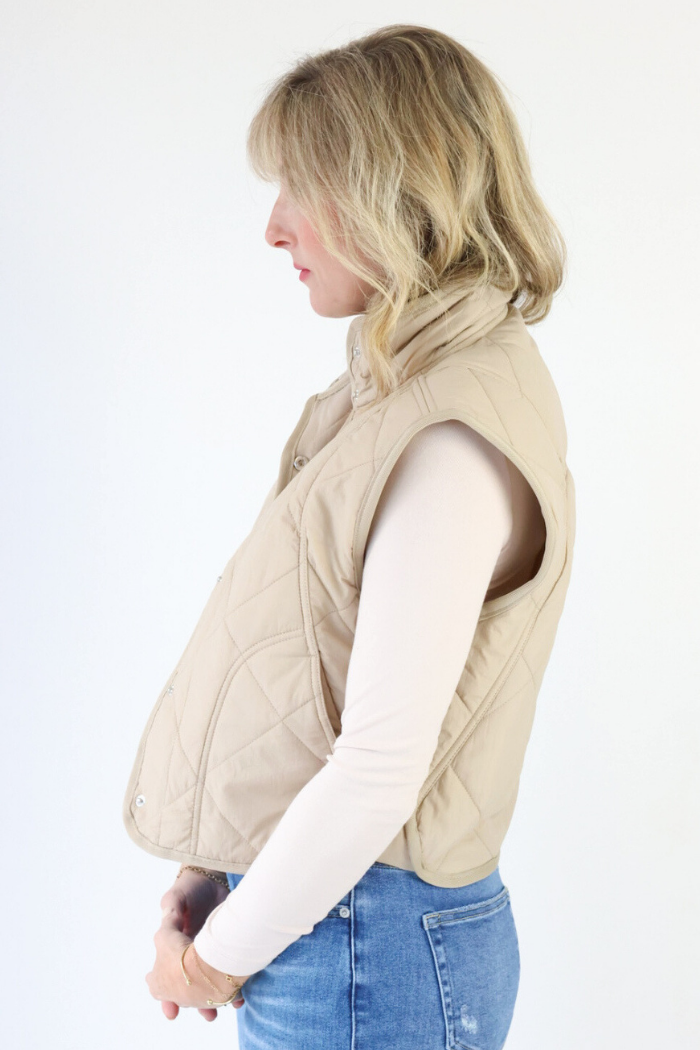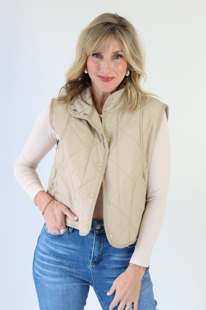 Stay stylish and cozy with our Snap Button Quilted Vest in Khaki, a versatile layering piece perfect for Nashville fashion lovers. Featuring a classic quilted design and an easy snap-button closure, this vest pairs effortlessly with a long-sleeve top and denim for crisp fall days or layered over a sweater for extra warmth in winter. Complete your look with boots or sneakers for chic, casual outfits that work for all ages and occasions!