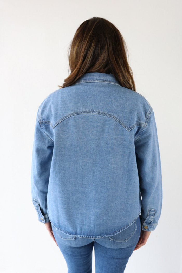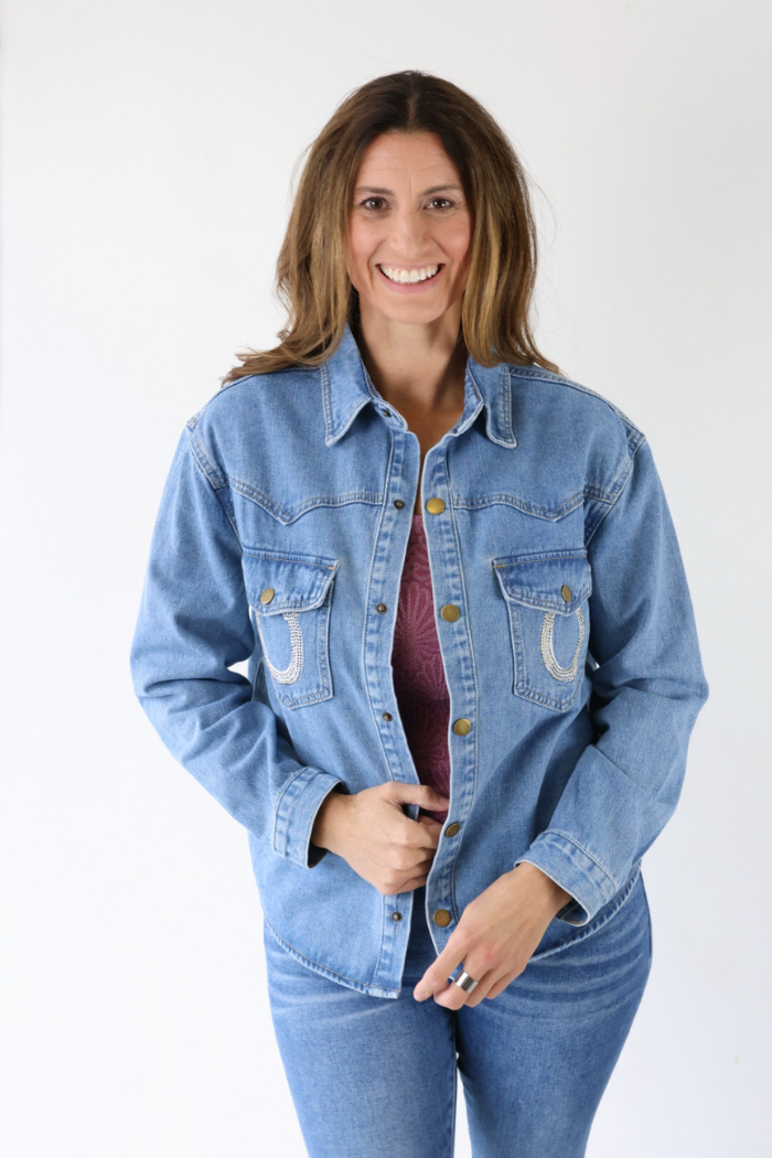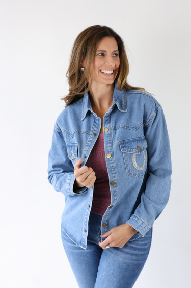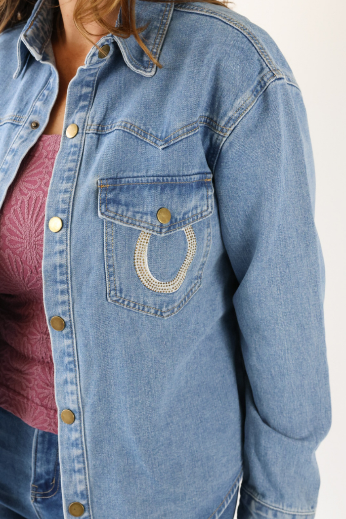 Rhinestone Horseshoe Denim Shacket in Medium Wash