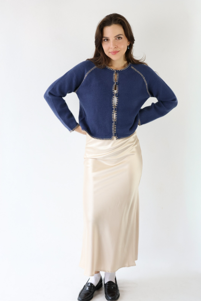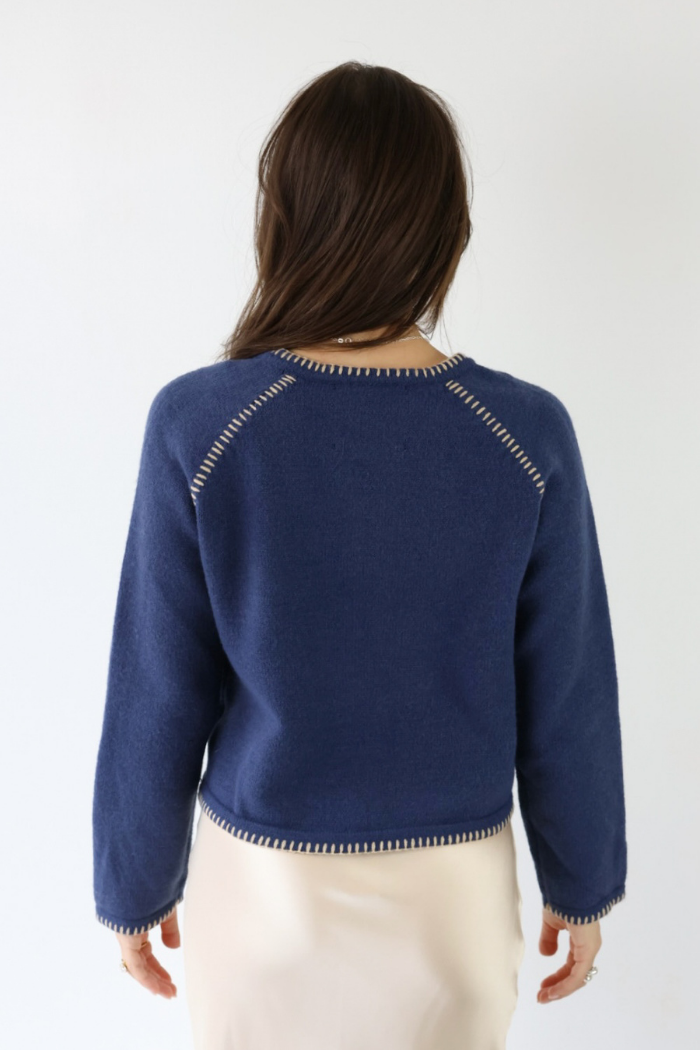 Add a unique touch to your wardrobe with the Contrast Blanket Stitch Cardigan in Navy, featuring brown blanket stitching and classic navy buttons. Its versatile design makes it perfect for all ages, whether styled buttoned up as a chic top or worn open over tees for a trendy Nashville-inspired layered look. Pair it with denim for everyday polish or dress it up with tailored pants for a refined finish!