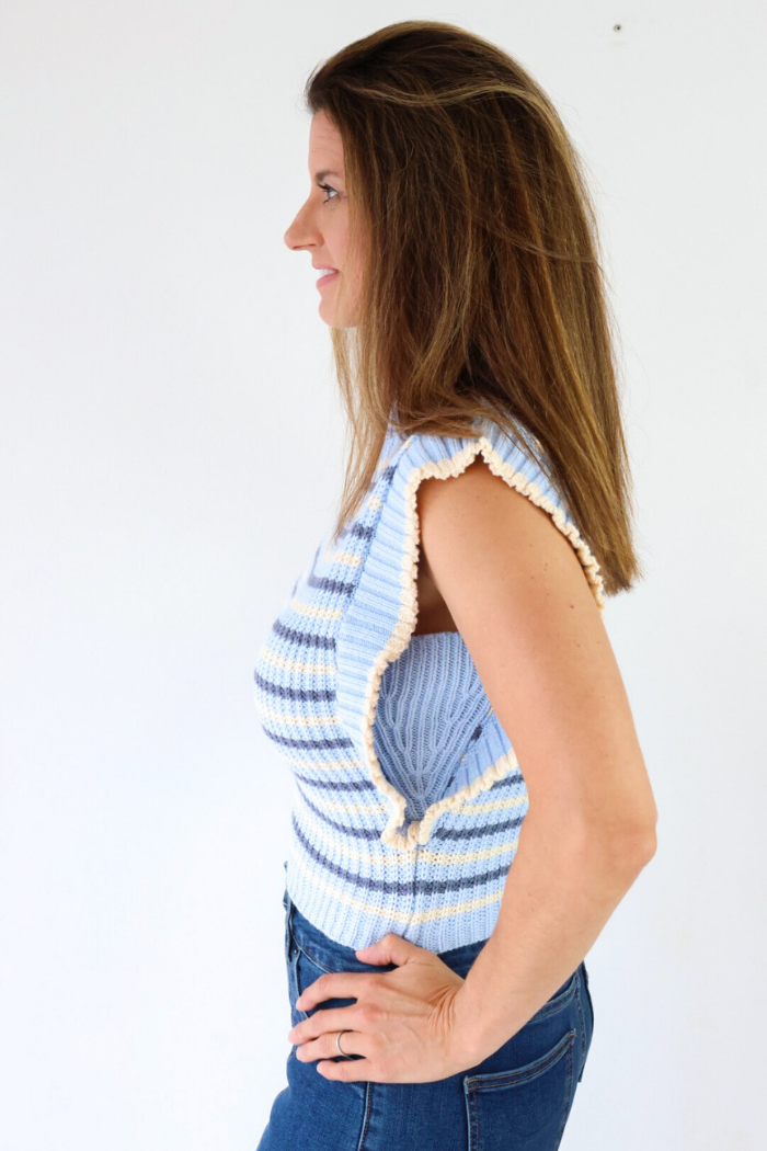 The Flutter Sleeve Mock Neck Striped Sweater in Blue is a bold yet versatile piece made for any trendsetter! Featuring chic flutter sleeves, a cozy mock neck, and a striking striped knit design, this sweater combines comfort with modern edge. Style it with tailored trousers for a polished look or pair with denim and boots for an effortlessly cool weekend vibe that stands out all season long!