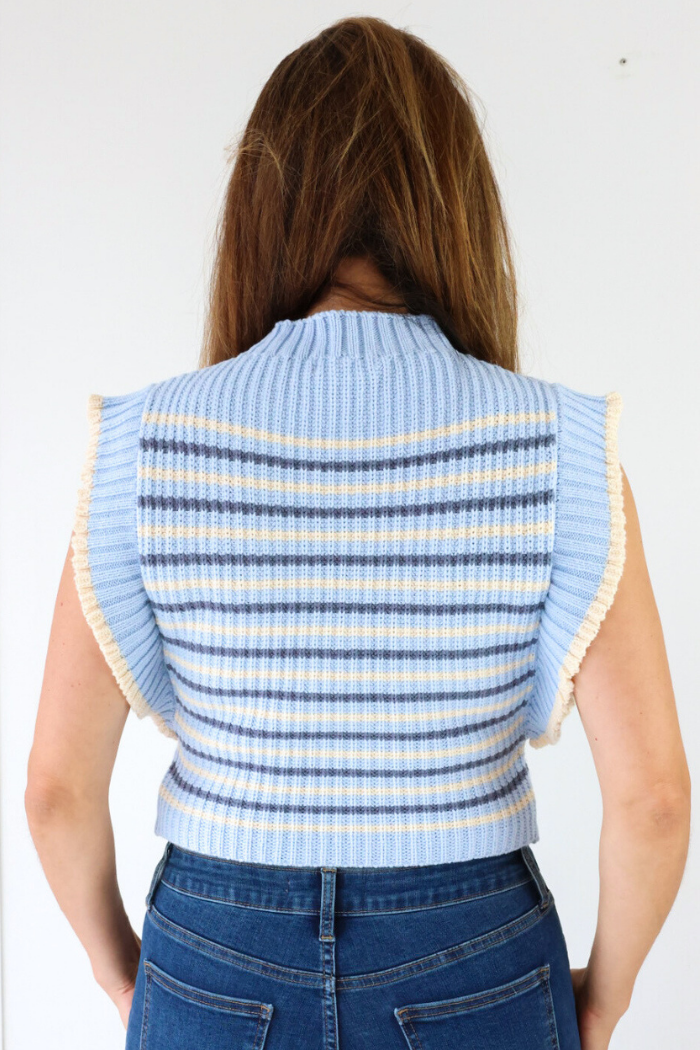 Flutter Sleeve Mock Neck Striped Sweater in Blue