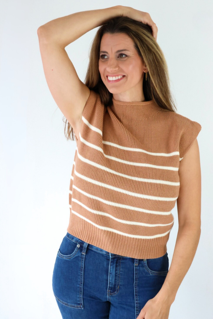 The Mock Neck Striped Sweater in Camel is a versatile piece every Nashville trendsetter needs. This sleeveless black sweater with crisp white stripes features a chic mock neckline that makes it perfect for layering. Style it over a fitted long sleeve, under a leather jacket, or wear it solo as a standout fall top. Whether dressed up with trousers or paired with denim, it adds an effortless edge to your wardrobe!