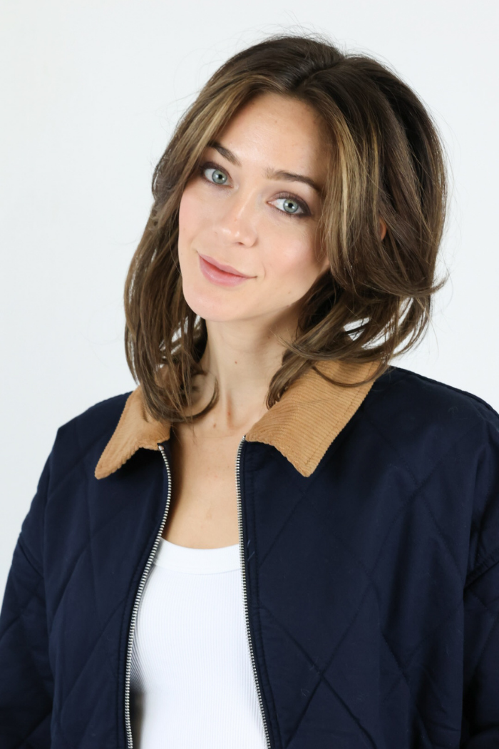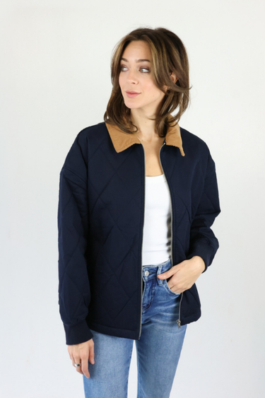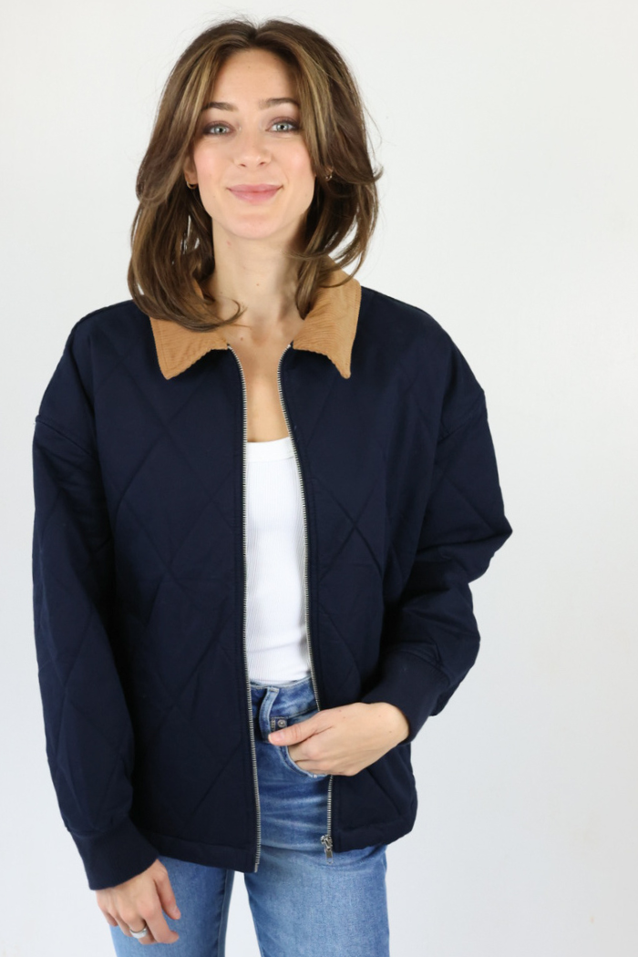 The Corded Collared Quilted Jacket in navy is a stylish, cozy layering piece featuring a camel corded collar and classic quilted design. Perfect for transitioning through seasons, it pairs effortlessly with jeans, skirts, or dresses to create chic Nashville outfits for all ages. Style it with boots and a scarf for a polished, on-trend look that keeps you warm and fashionable in every season!