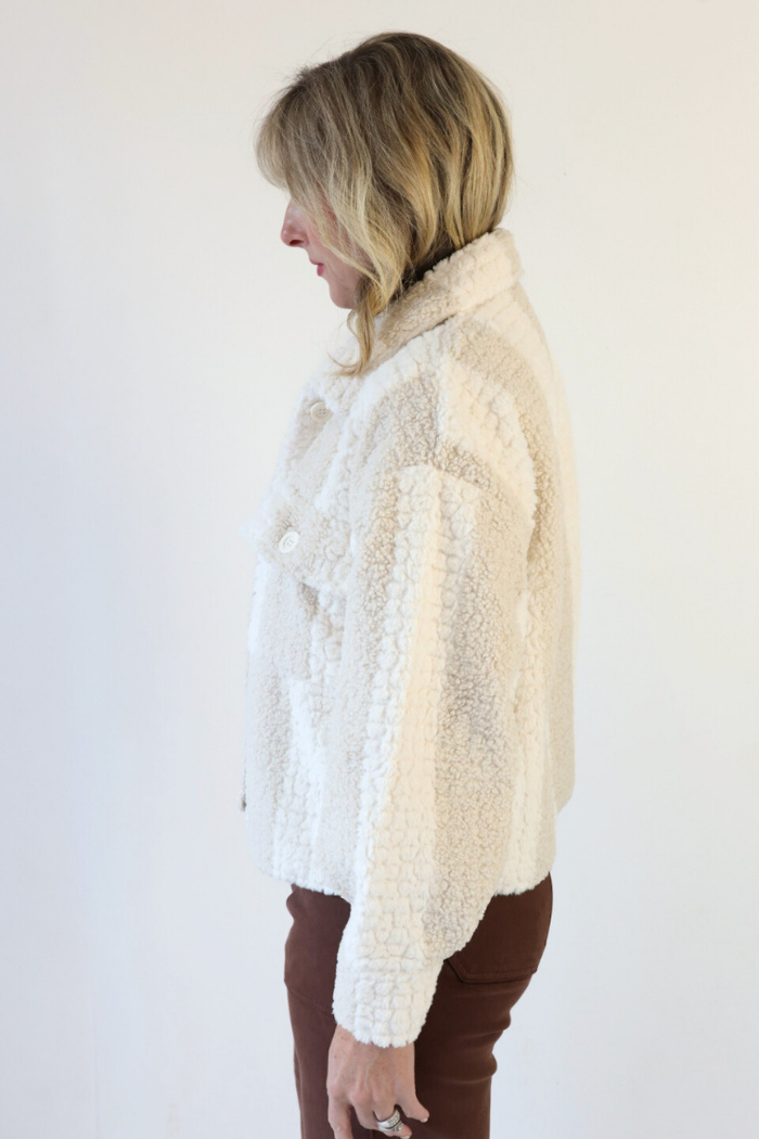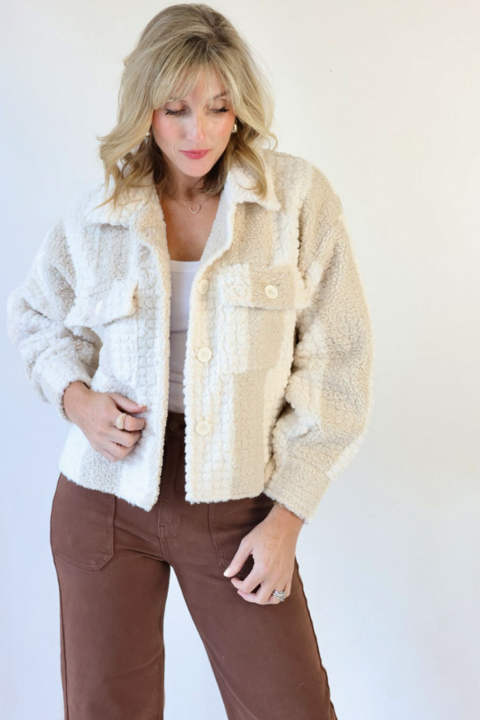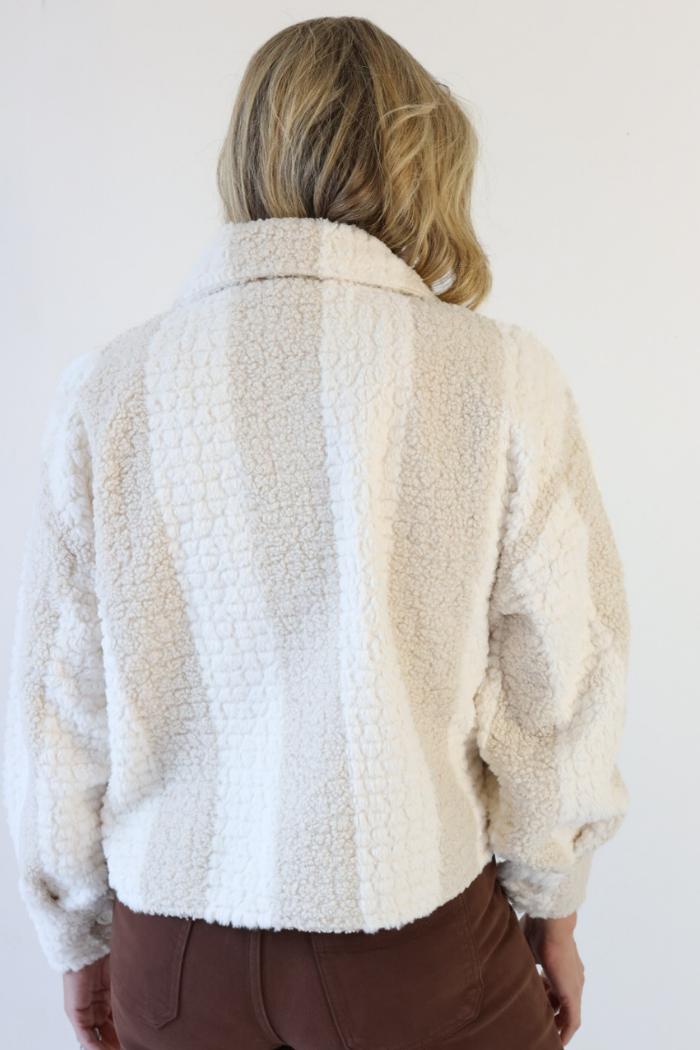 Stay cozy and on-trend in our Faux Shearling Stripe Jacket in Khaki! With its soft faux sherpa texture and stylish striped design, this jacket adds the perfect mix of comfort and chic to your fall wardrobe. Ideal for layering over knits or graphic tees, it brings a laid-back Nashville vibe to any outfit. Pair it with jeans and boots for a casual day look or dress it up with leather leggings for night outings!