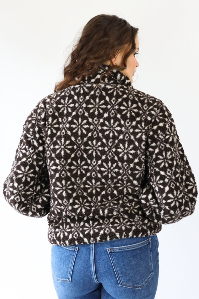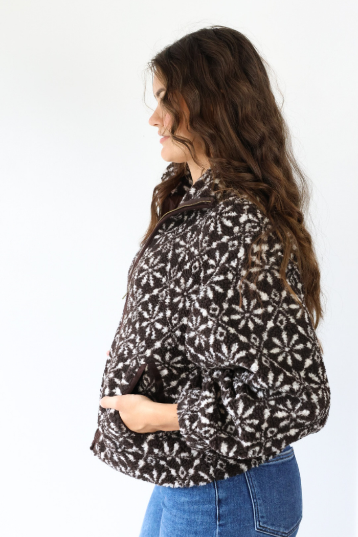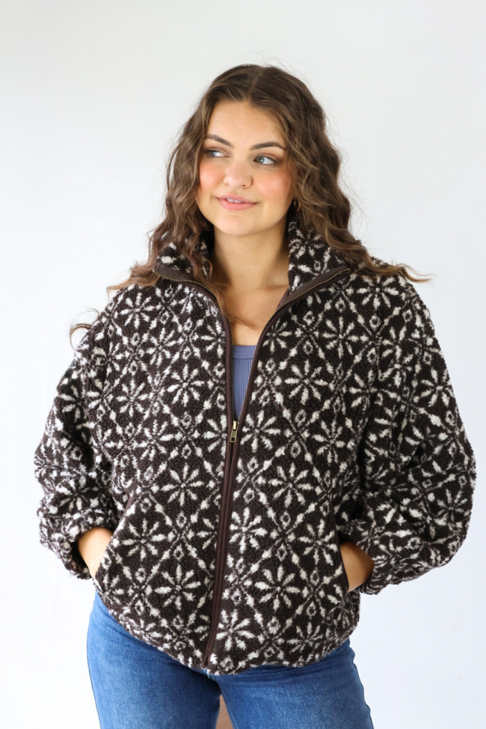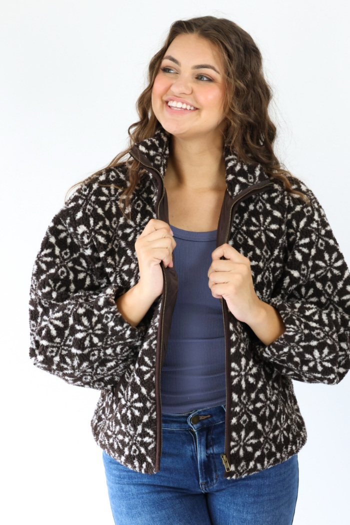 Cozy up in style with our Snowflake Sherpa Jacket in Brown! This soft sherpa parka features a charming snowflake design, a full zip front, practical pockets, and a collar that makes it perfect for chilly days. Ideal for layering over sweaters or flannels, this jacket brings a touch of winter charm to your Nashville-inspired wardrobe. Stay warm, trendy, and ready for the season in this cozy favorite!