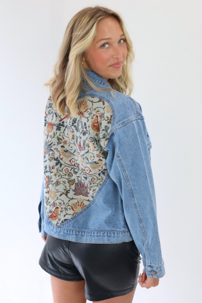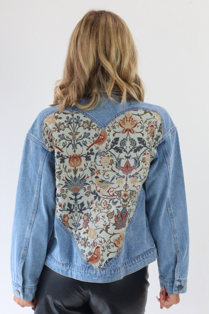 Stand out in the Tapestry Back Denim Jacket, a trendy layering piece perfect for fall. This classic denim jacket features a striking tapestry heart on the back, adding a unique and playful detail to your look. Pair it with dresses, skirts, or jeans for a Nashville-inspired outfit that balances casual cool with bold style. Perfect for layering over tees or sweaters to elevate your seasonal wardrobe with charm and personality!