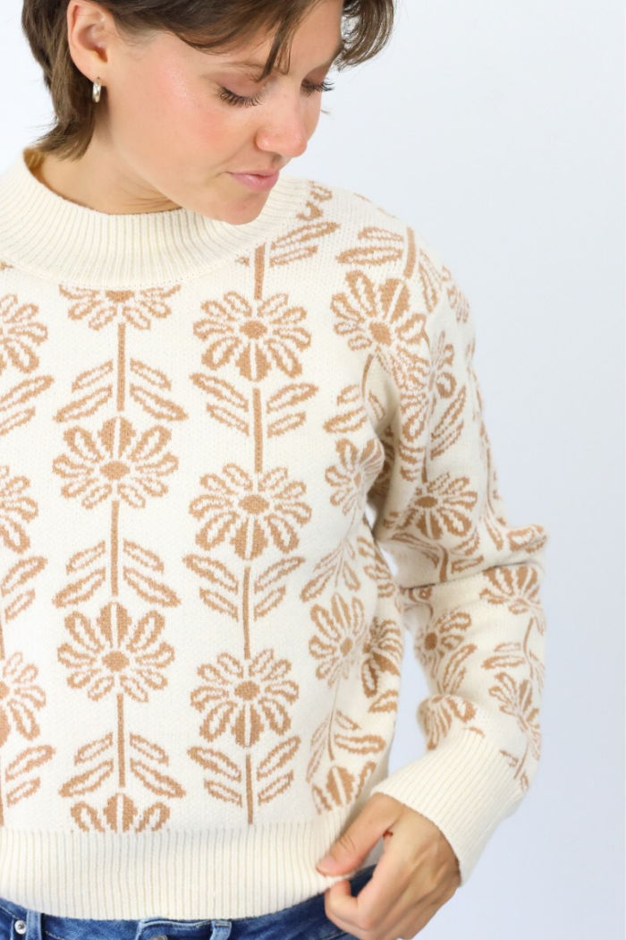 Step into autumn in the Floral Pattern Sweater in Beige, perfect for cozy fall days and pumpkin festival fun. This soft, neutral-toned sweater features a delicate floral pattern that adds a feminine touch to any outfit. Pair it with high-waisted jeans and ankle boots for a chic casual look or layer over a skirt for a seasonal ensemble. Effortless style meets comfort for all your fall adventures!