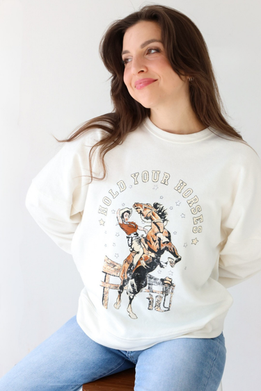 The Hold Your Horses Sweatshirt in Ivory is a casual and trendy staple featuring a classic crew neck and playful graphic lettering. Its relaxed fit makes it perfect for layering over tees or pairing with high-waisted jeans, leggings, or skirts for a laid-back Nashville-ready look. Cozy, comfortable, and effortlessly stylish, this sweatshirt adds a fun, fashion-forward touch to everyday outfits while keeping you warm and chic!