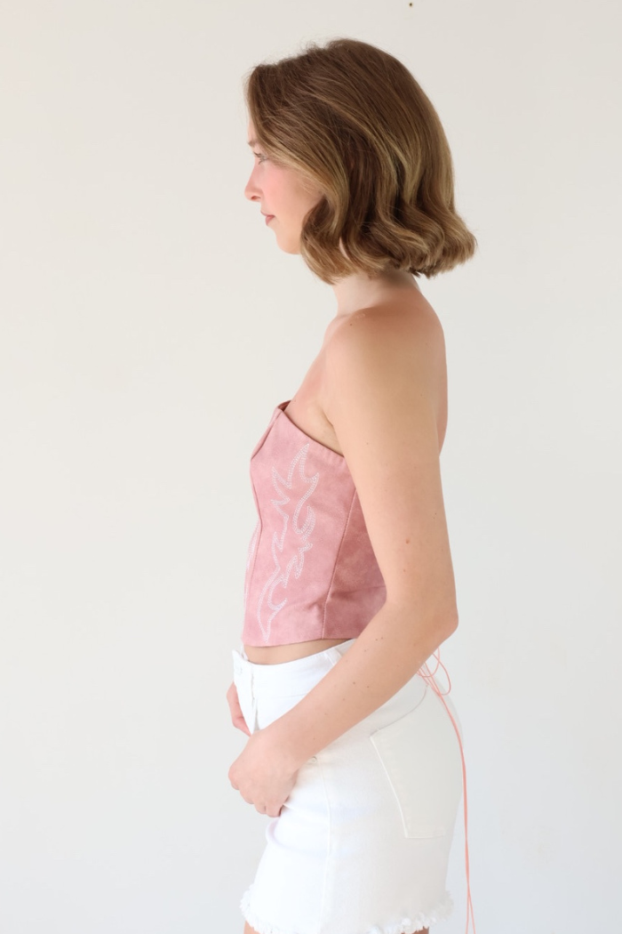 Make a bold statement in the Faux Leather Embroidered Western Corset Top in Pink. Designed with a strapless bandeau fit and boned panel construction, this crop top brings a modern twist to classic western fashion. The intricate embroidered detailing and rope lace-up back add eye-catching texture, perfect for festival days or Nashville nights. Style it with denim shorts and boots for a western-chic look that turns heads!