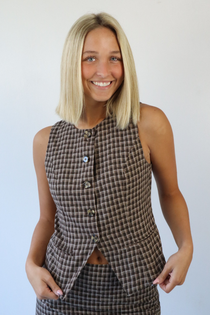 Turn heads this season in the Plaid Vest in Brown! This sleeveless, round neck vest features a timeless brown plaid pattern with front button details for a polished, versatile look. Style it with the matching mini skirt for a chic holiday-ready set, or pair it with black jeans and tall boots for a cozy yet elevated Nashville-inspired outfit that’s perfect for any occasion!