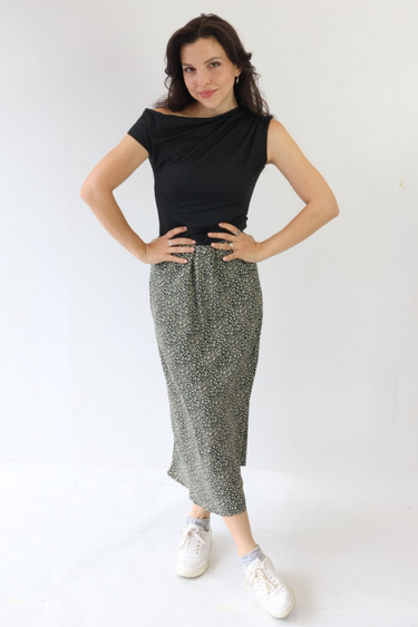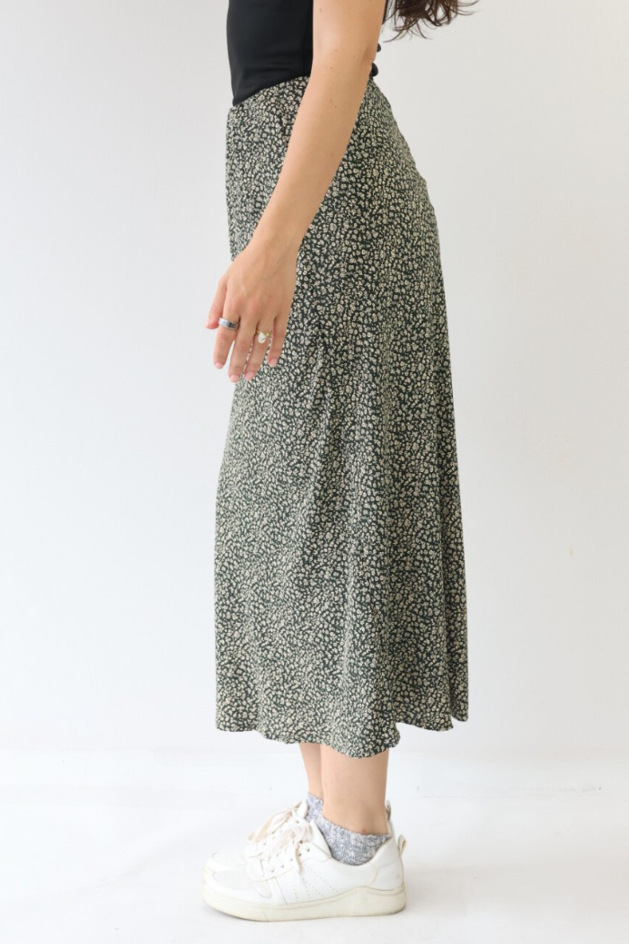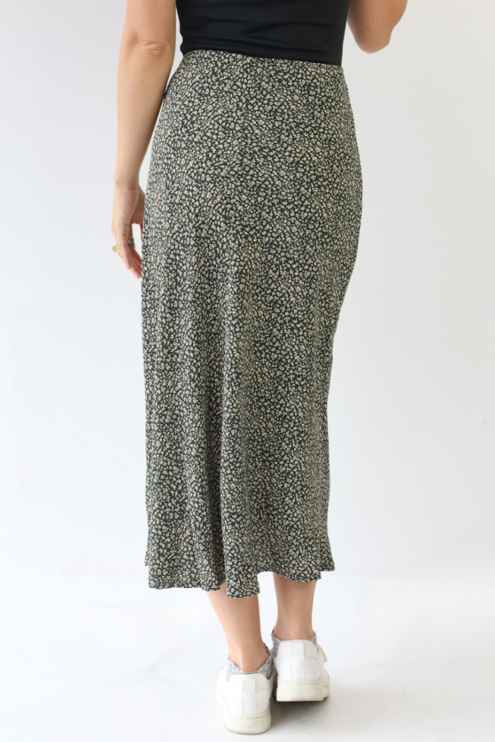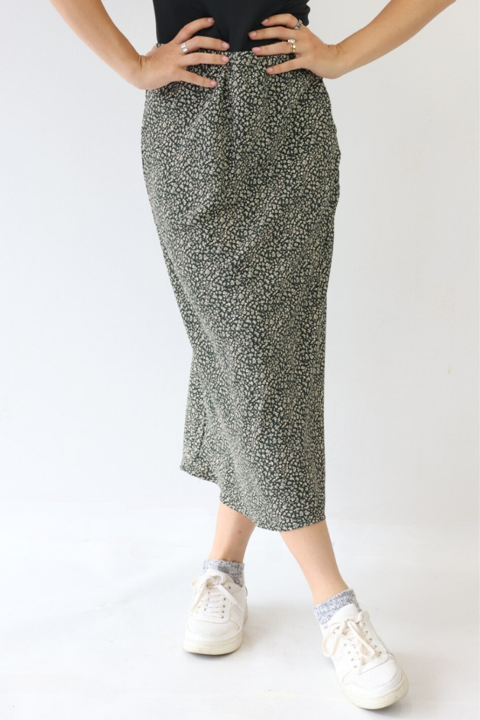 Bring effortless charm to your wardrobe with the Ditsy Satin Midi Skirt in Dark Green. Featuring a subtle floral print and silky satin finish, this skirt moves beautifully with every step. The midi length makes it perfect for pairing with boots and a chunky sweater for a cozy fall vibe or dressing up with a blouse for an evening out. Chic, versatile, and full of seasonal style, this skirt is a must-have for every Nashville trendsetter!