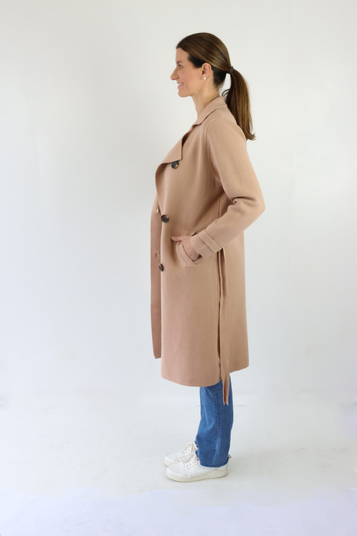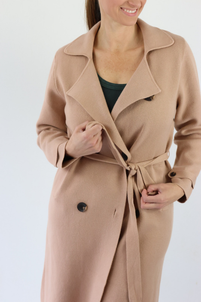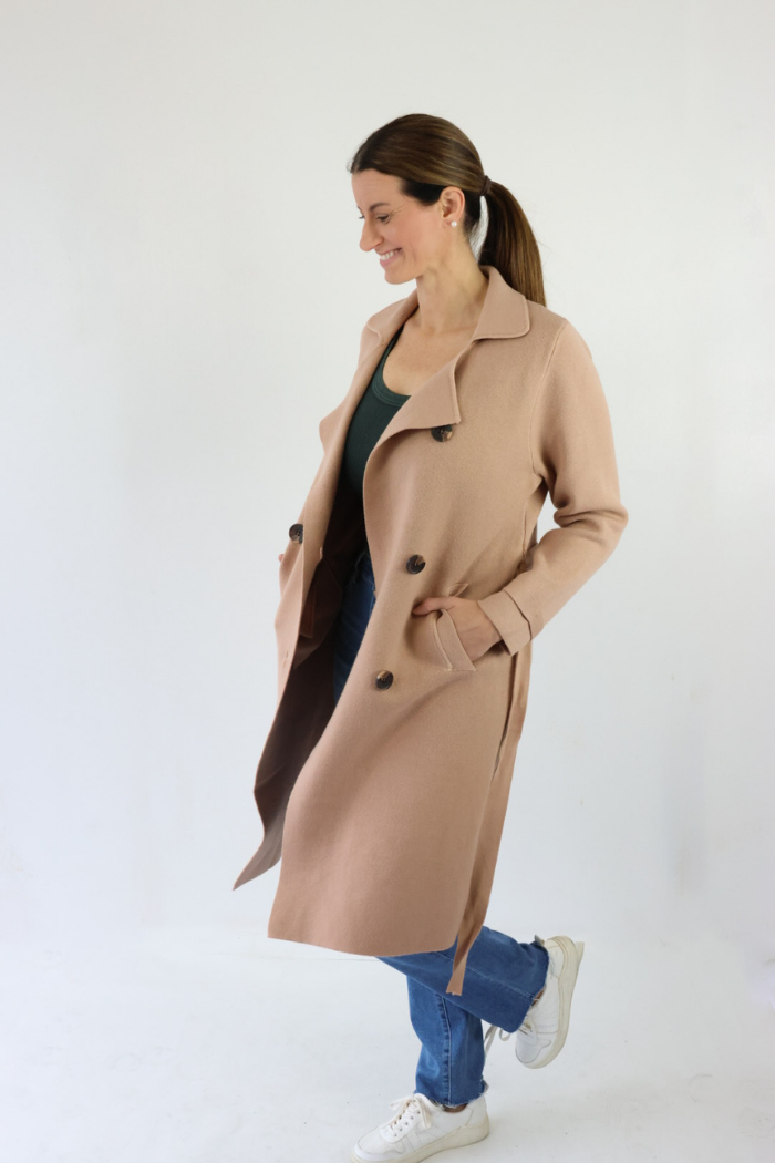 Elevate your outerwear game with our Double Breasted Coat in camel. This knit trench coat, crafted from a luxurious cashmere blend, features a self-tie belt for a flattering silhouette and timeless appeal. Perfect for layering over your favorite fall and winter looks, it pairs effortlessly with dresses, boots, or jeans for a chic, polished outfit. A must-have for staying cozy and stylish all season long!