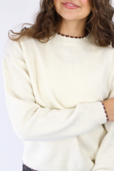 Elevate your fall and winter wardrobe with the Contrast Knit Scalloped Edge Sweater in Ivory, a chic and versatile staple. This heathered crewneck sweater features a round neckline, drop shoulder long sleeves, and elegant scalloped edges in contrasting brown knit along the neckline, cuffs, and hem. Pair it with jeans and boots for a casual Nashville look or layer over skirts for a polished seasonal outfit. Effortless style meets cozy comfort!