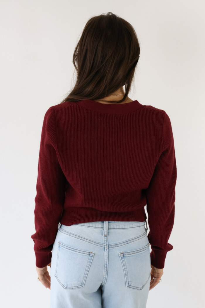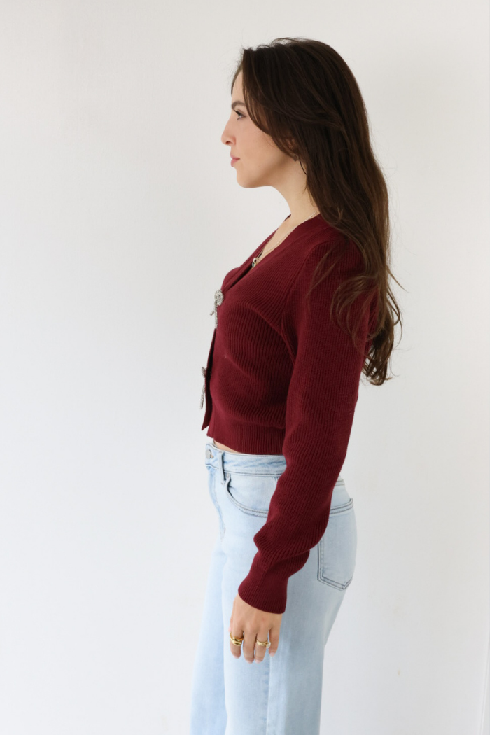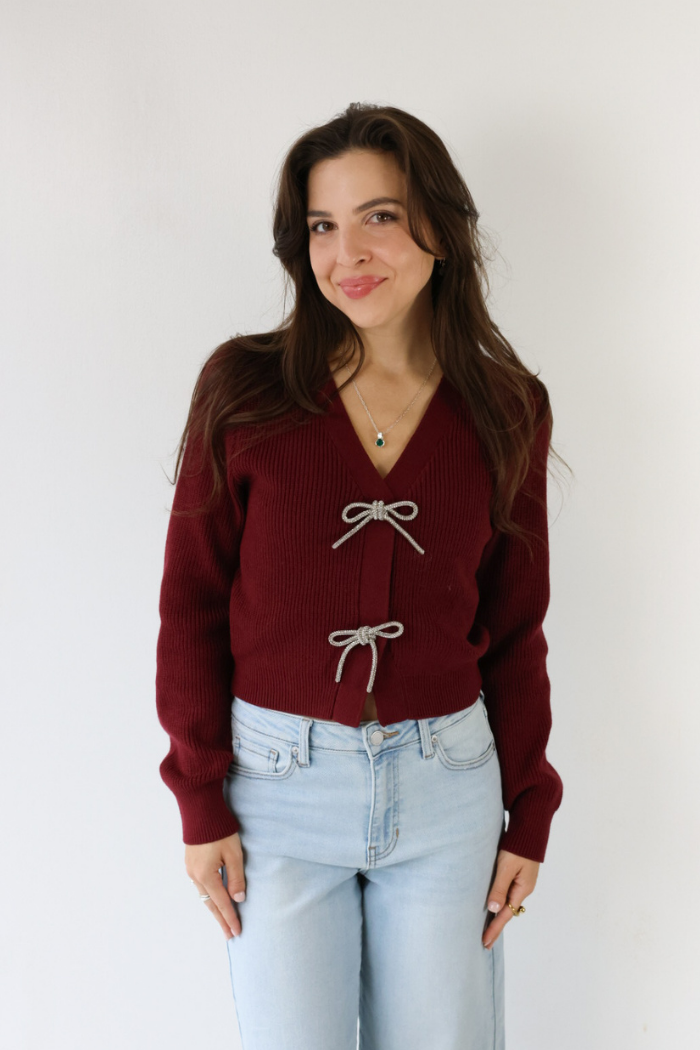 Elevate your Nashville inspired wardrobe with this burgundy v neck cardigan featuring two silver sparkle bows that add a playful, trendy touch. Its soft long sleeve sweater knit layers effortlessly over tees or dresses for chic styling across all ages. Pair it with denim, faux leather, or a satin skirt for a polished seasonal look that shines!