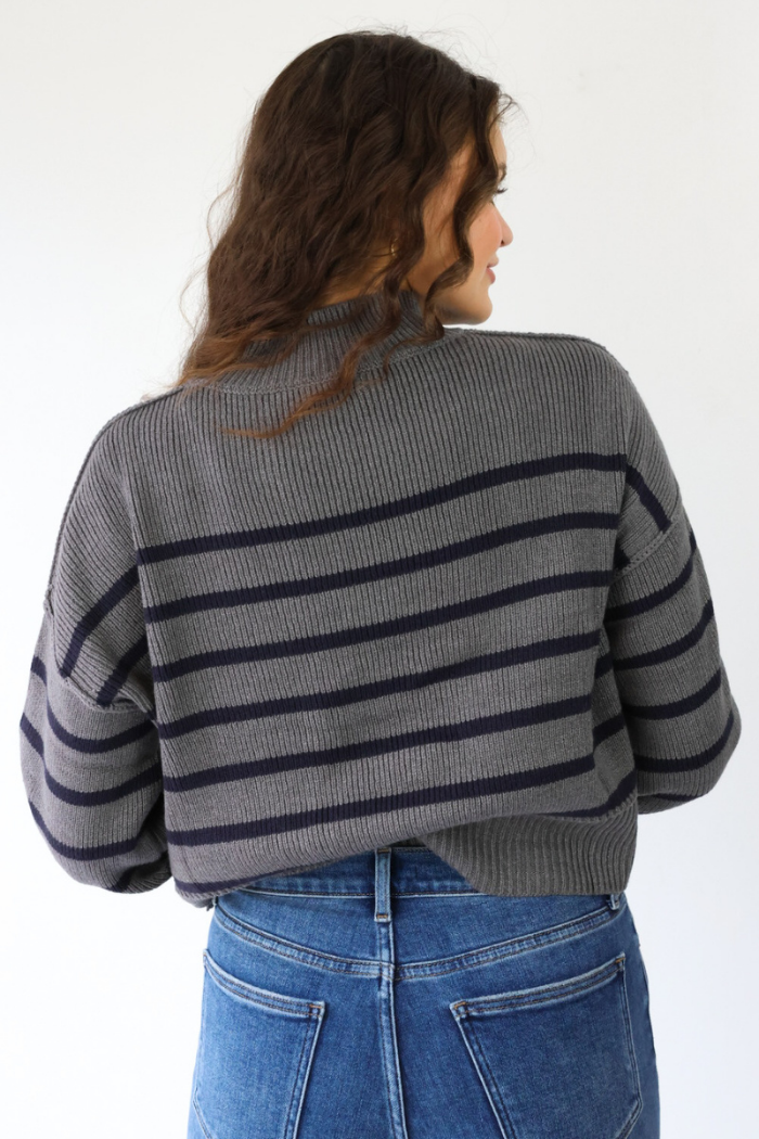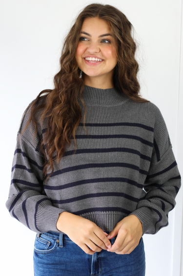 Stay effortlessly chic in the Mock Neck Striped Sweater in Charcoal, a versatile staple for fall and winter wardrobes. This soft knit sweater features a flattering mock neckline and subtle black stripes for a modern, polished look. Pair it with high-waisted jeans and ankle boots for a casual Nashville-ready outfit or layer under a jacket for added warmth and style. Cozy, stylish, and perfect for everyday wear!