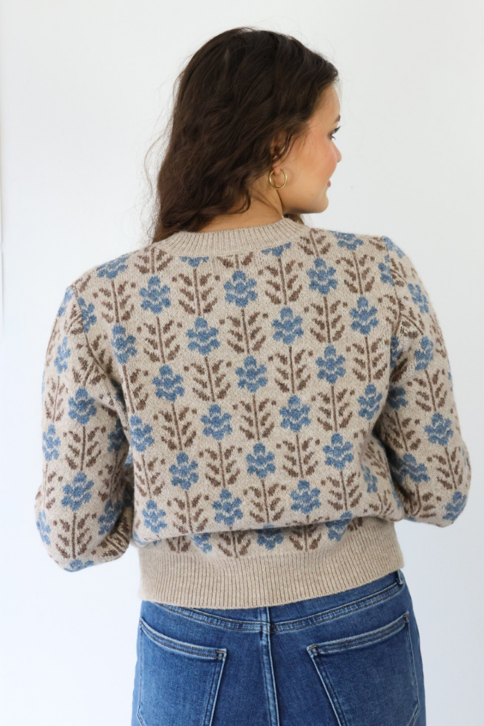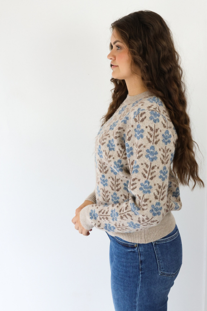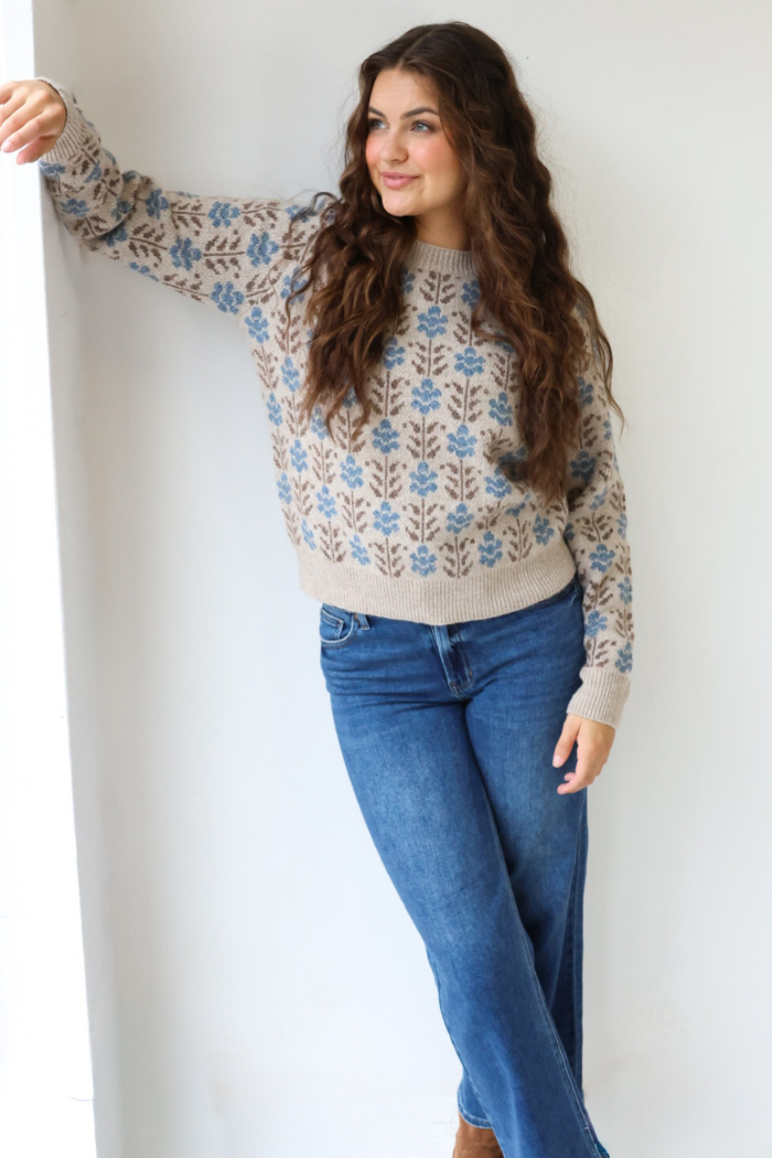 Add a touch of vintage charm to your wardrobe with our Mock Neck Floral Sweater in Taupe & Blue! This cozy knit features a soft taupe base with delicate brown and blue floral details, perfect for elevating your fall-to-winter looks. Style it layered under a jacket or over a collared top and finish with gold or silver jewelry for a polished Nashville-inspired outfit that stands out all season!