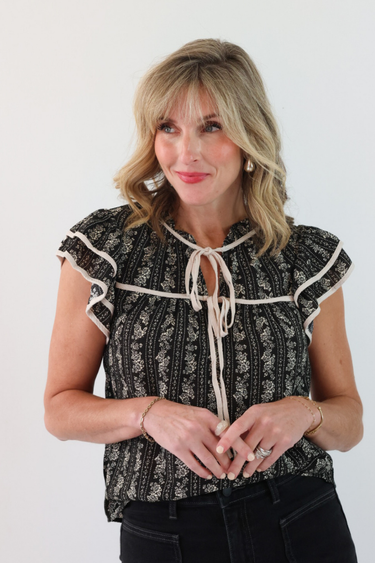 The Floral Tie Neck Top in Black brings a feminine touch to any outfit with its flutter short sleeves and delicate bow ties at the neckline. The floral striped pattern adds timeless charm, making it perfect for both casual and dressy looks. Style with denim for a chic daytime outfit or tuck into a skirt and add heels for an elevated night-out look. A year-round favorite for every stylish woman!