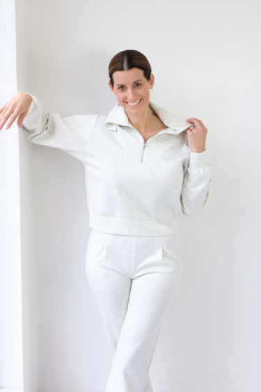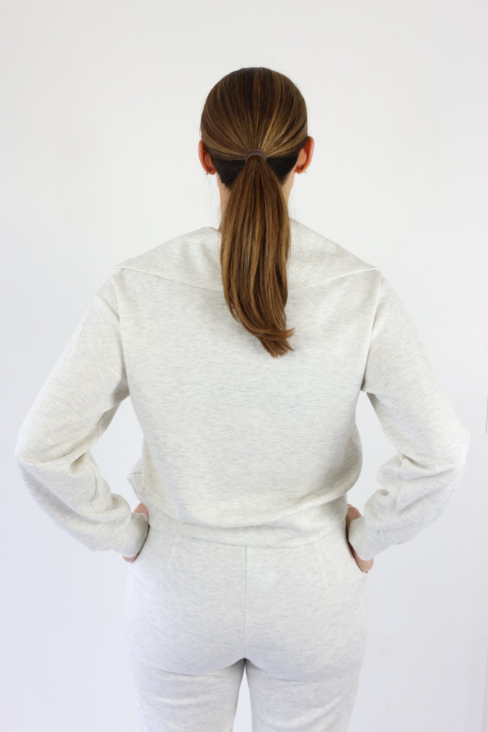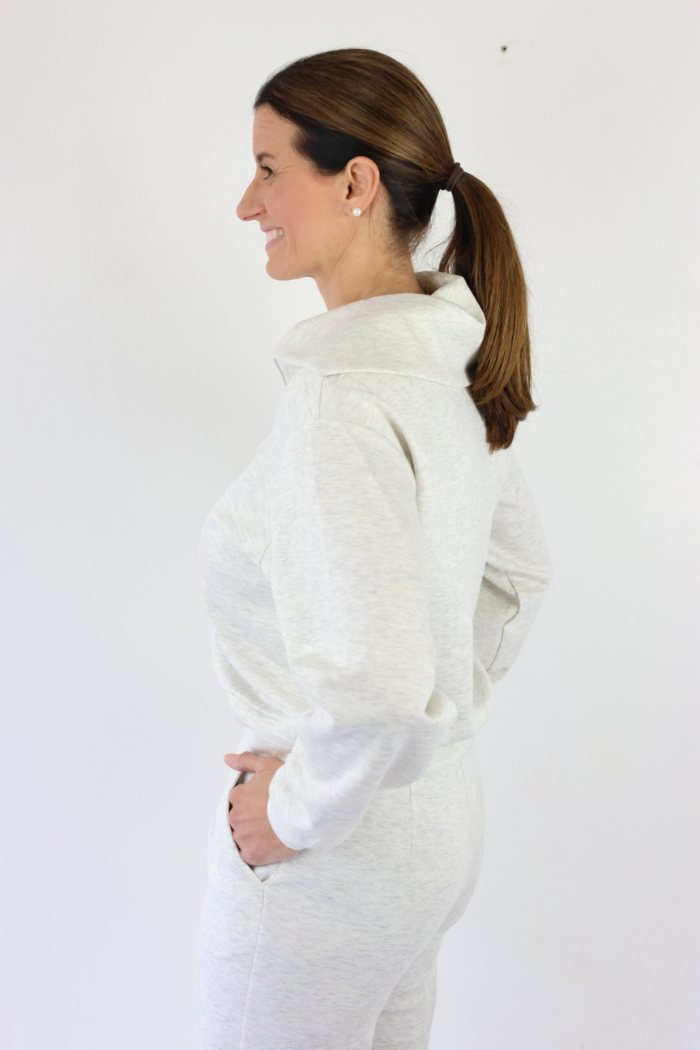 Refresh your Nashville style with this half zip scuba collared top in a soft oat shade, perfect for trendy women of all ages who love elevated comfort. The structured collar and modern half zip design create a polished yet relaxed look that transitions effortlessly from lounging to errands. Wear it with the matching sweatpants for a chic coordinated set, or style with denim and sneakers for casual Southern cool that feels current and easy!