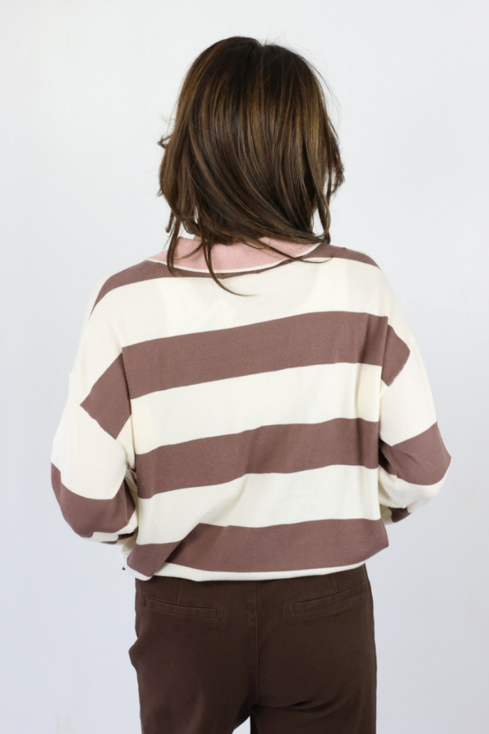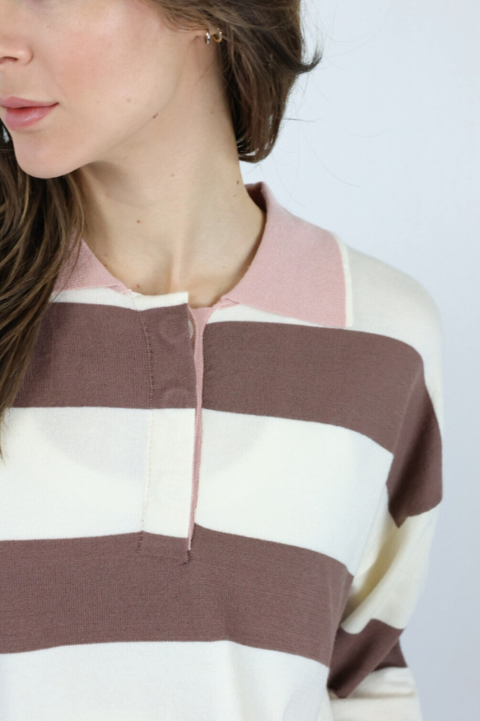 Make a bold statement with this long-sleeve top featuring vibrant ivory and brown stripes and a crisp pink collar. Its sporty yet trendy vibe fits perfectly into Nashville fashion and flatters all ages. Style it with high-rise denim and sneakers for a casual day look or pair with a mini skirt and boots for a fun, elevated outfit!