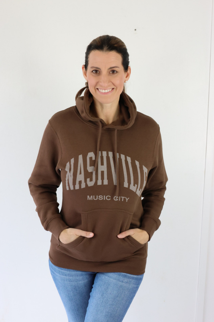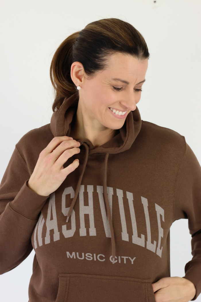 Stay cozy and stylish with this Nashville vintage hoodie in warm brown, perfect for trendy women of all ages who love casual, comfortable fashion. Featuring a light brown Nashville Music City graphic, long sleeves, and a drawstring hood, this hoodie pairs effortlessly with denim for city exploring or leggings for relaxed lounging. Style it with sneakers or boots for an easy, chic look that combines laid back comfort with Southern flair!