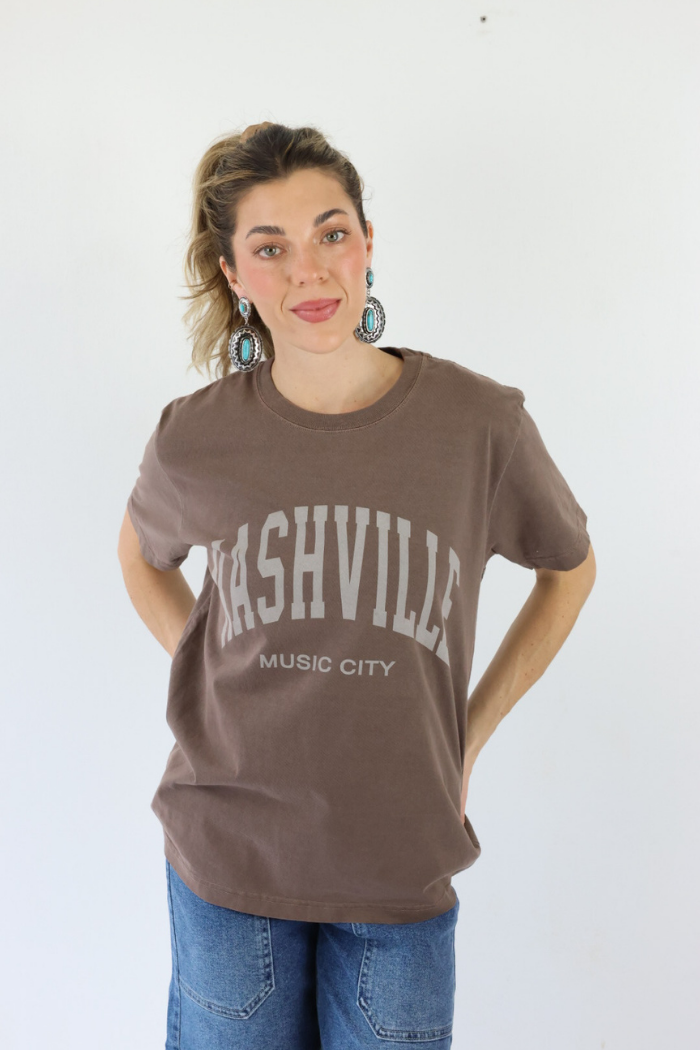 Celebrate iconic Nashville style with this Nashville Vintage Tee in a rich brown shade, perfect for both tourists and locals who love effortless, trendy fashion. This classic graphic tee brings laid back Southern charm with a vintage-inspired feel that works year round. Style it with denim shorts, relaxed jeans, or layered under a jacket for casual days exploring the city or everyday wear that feels timeless, comfortable, and flattering for women of all ages!