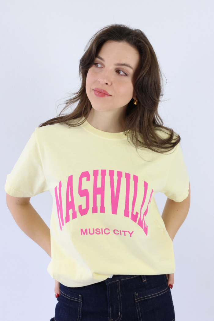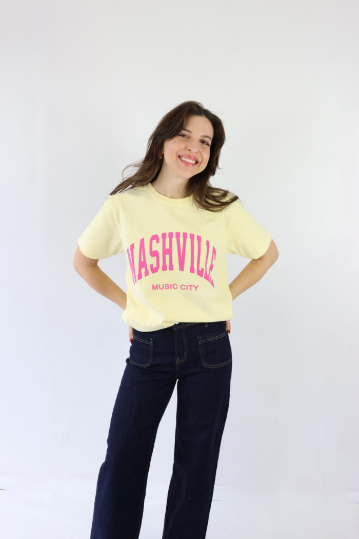Bring a pop of color to your everyday style with this Nashville Vintage Tee in a cheerful yellow shade. Featuring a bold pink Nashville graphic, this tee captures trendy Southern charm with a playful twist. Style it with denim shorts, relaxed jeans, or layered under a jacket for an easy Nashville look that works for all ages. Perfect for casual days, concerts, or weekend outings, this tee blends comfort with standout style that feels effortless and fun!