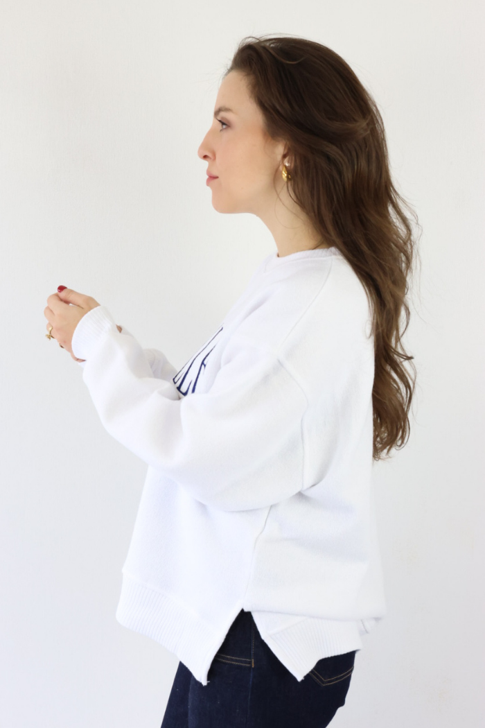 Show off trendy Nashville style with this white embroidered split hem pullover, perfect for women of all ages who love comfortable, polished fashion. Featuring a classic crewneck and navy blue Nashville embroidery, this pullover pairs effortlessly with denim for casual outings or leggings for cozy lounging. Style it with sneakers or ankle boots and layer with a jacket for a chic, relaxed look that feels modern, versatile, and effortlessly stylish!