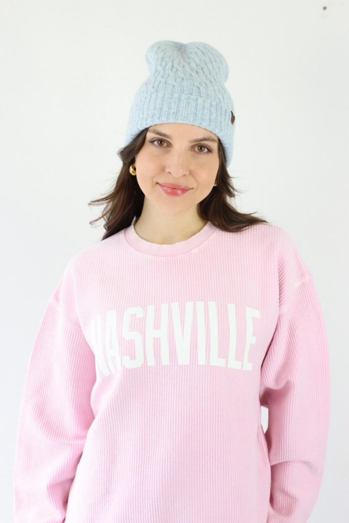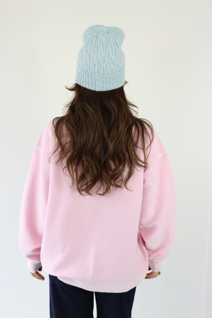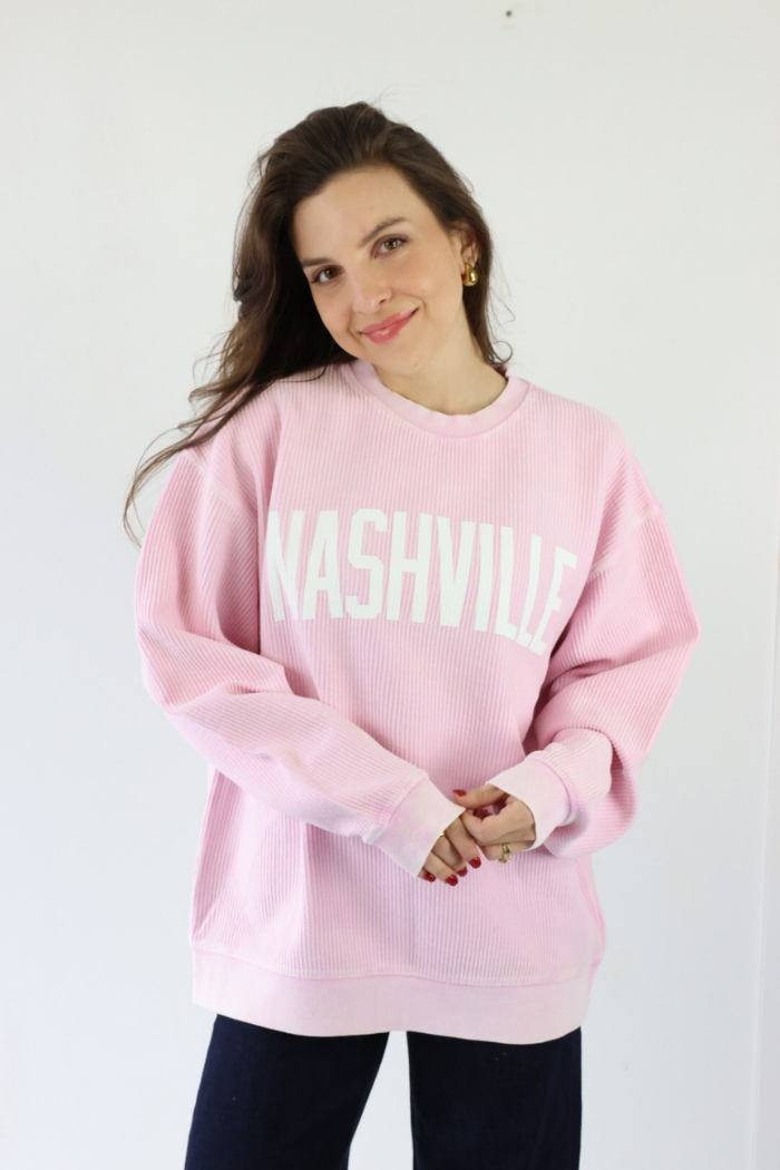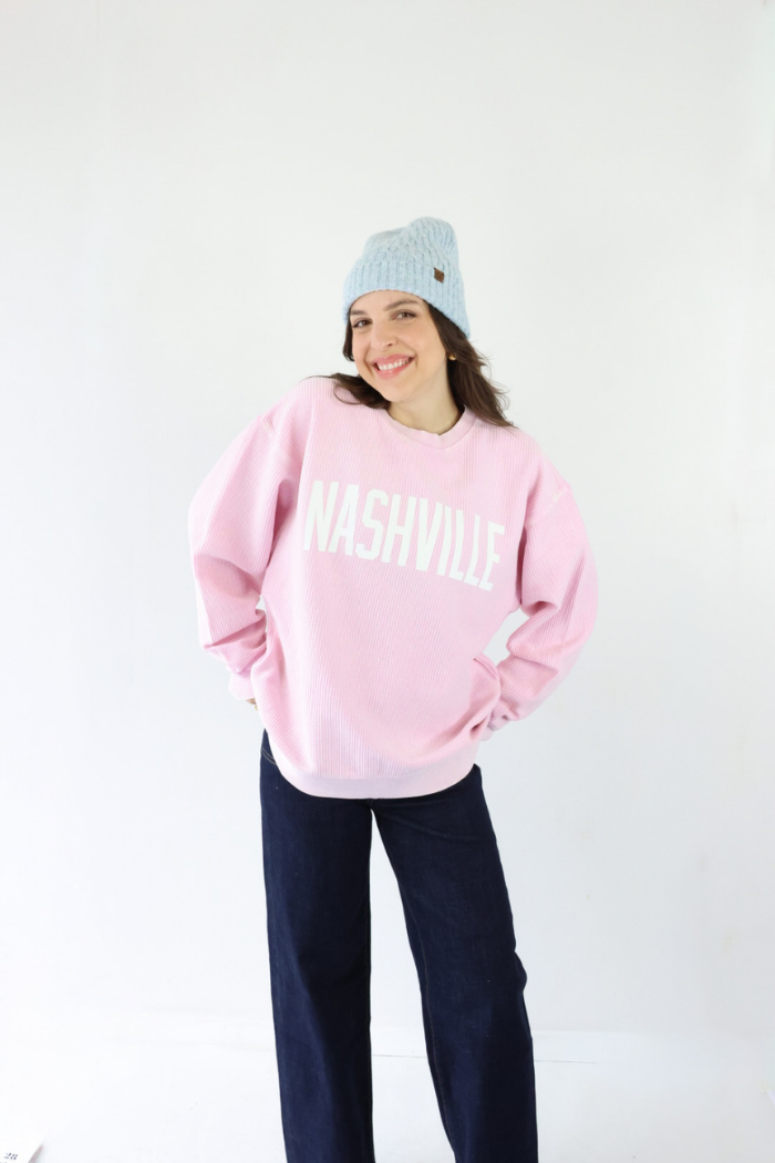 Add playful Nashville style to your wardrobe with this Nashville corded crew in a soft light pink, perfect for trendy women of all ages who love cozy and versatile pieces. Featuring long sleeves and a relaxed fit, this corded crew pairs effortlessly with denim for casual outings or with leggings for lounging at home. Style it with sneakers, boots, or layer under jackets for a chic, comfortable look that feels effortlessly fun and modern!
