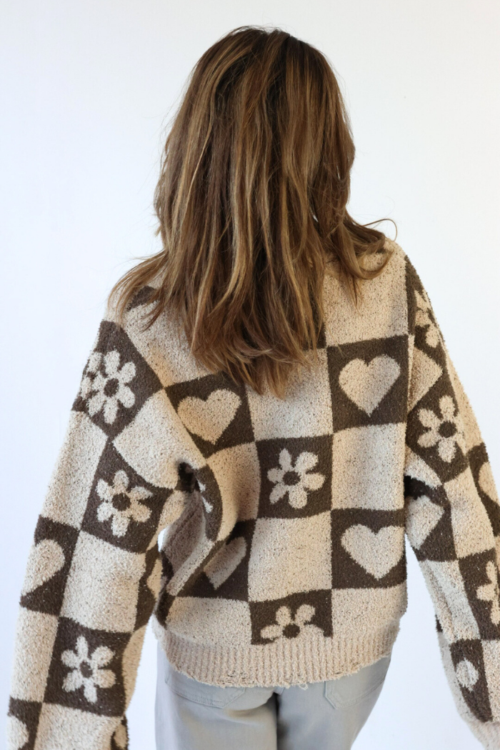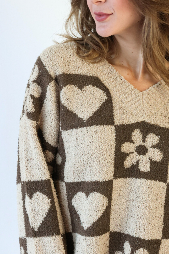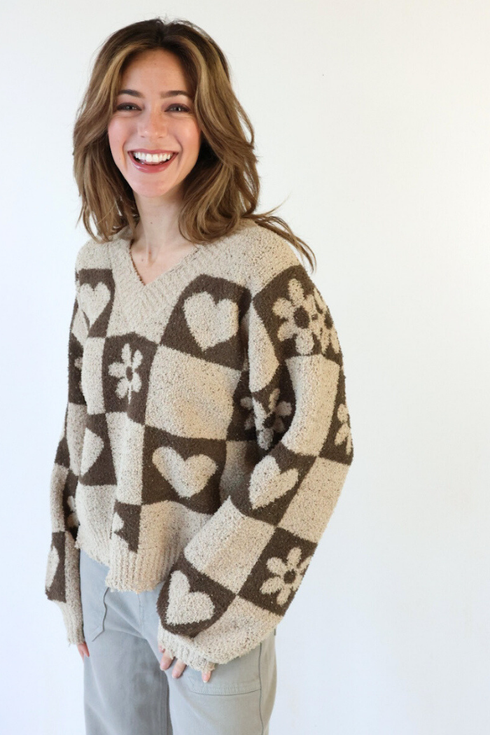 Add playful charm to your wardrobe with our Flower Print Chenille Sweater in Brown! This V-neck sweater features a cozy chenille texture with light and dark brown checkered hearts and floral patterns, perfect for layering over jeans or skirts for a chic Nashville look. Pair it with ankle boots for casual days or dress it up with leather pants for a trendy, polished outfit. Its versatile style makes it a must-have for women of all ages looking to stay stylish!