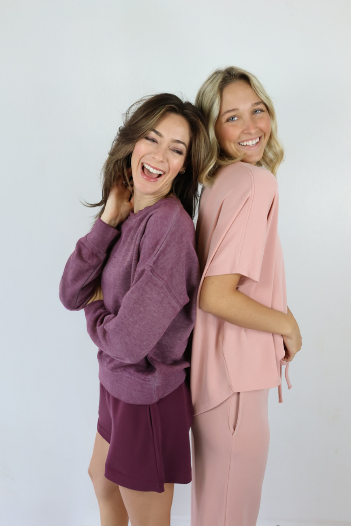 Relax in style with these purple Elastic Waist Lounge Shorts, crafted from the same silky modal blend as the Soft Drape Raglan Tee for a perfectly coordinated look. The elastic waistband ensures all day comfort while the subtly relaxed fit flatters every frame. Pair them with the matching tee for a chic lounge set or style with a casual tank for effortless Nashville inspired comfort and trend forward appeal!